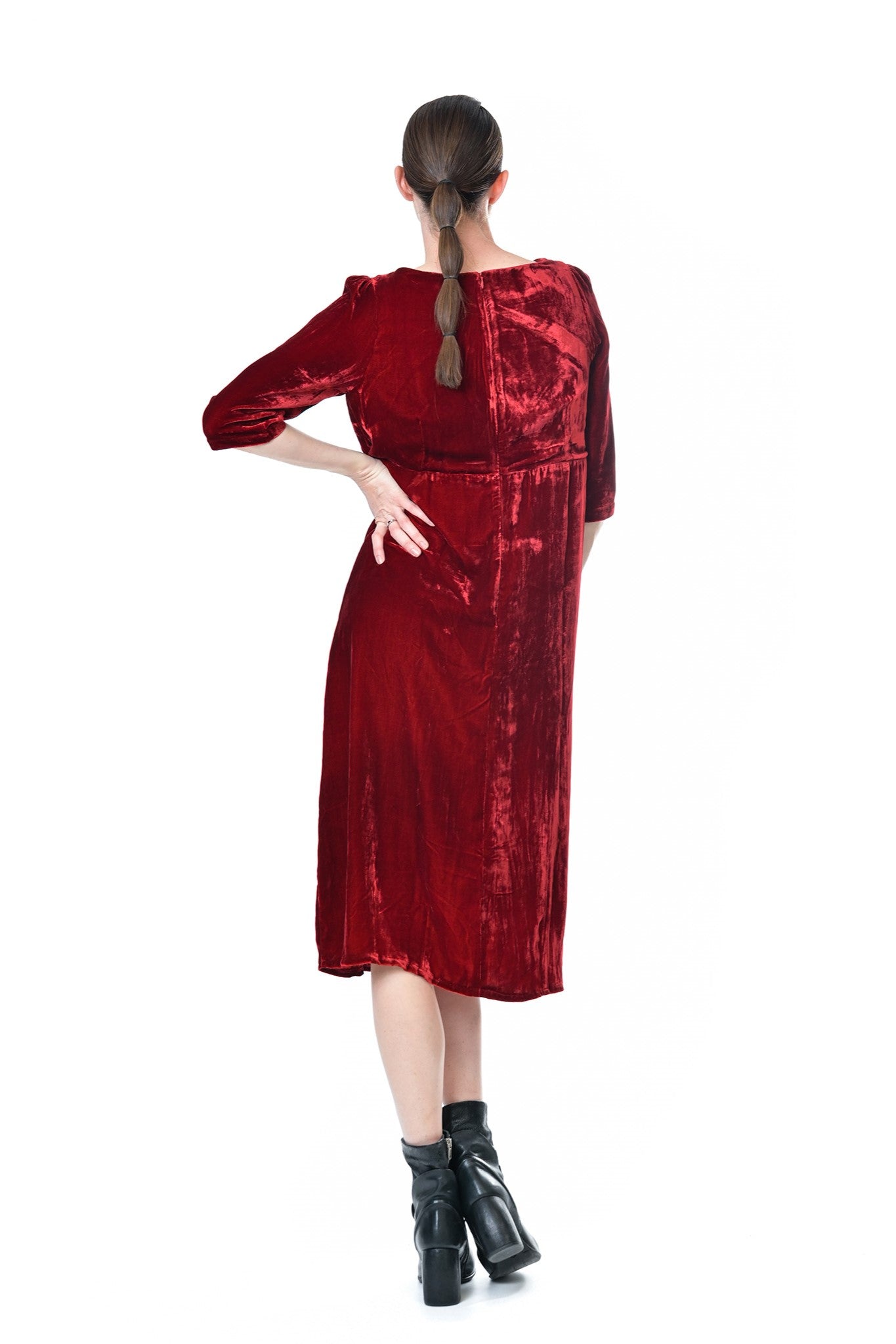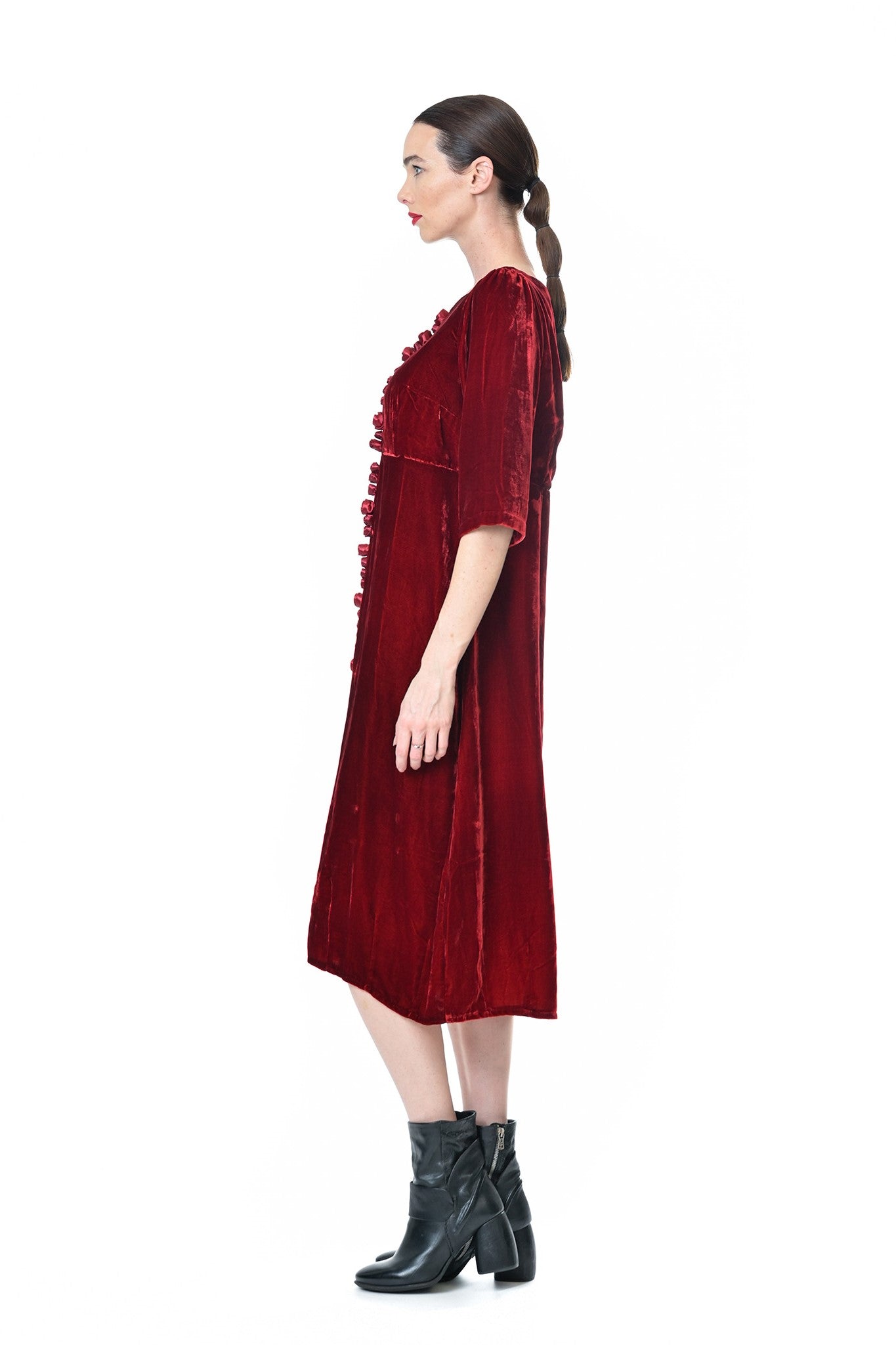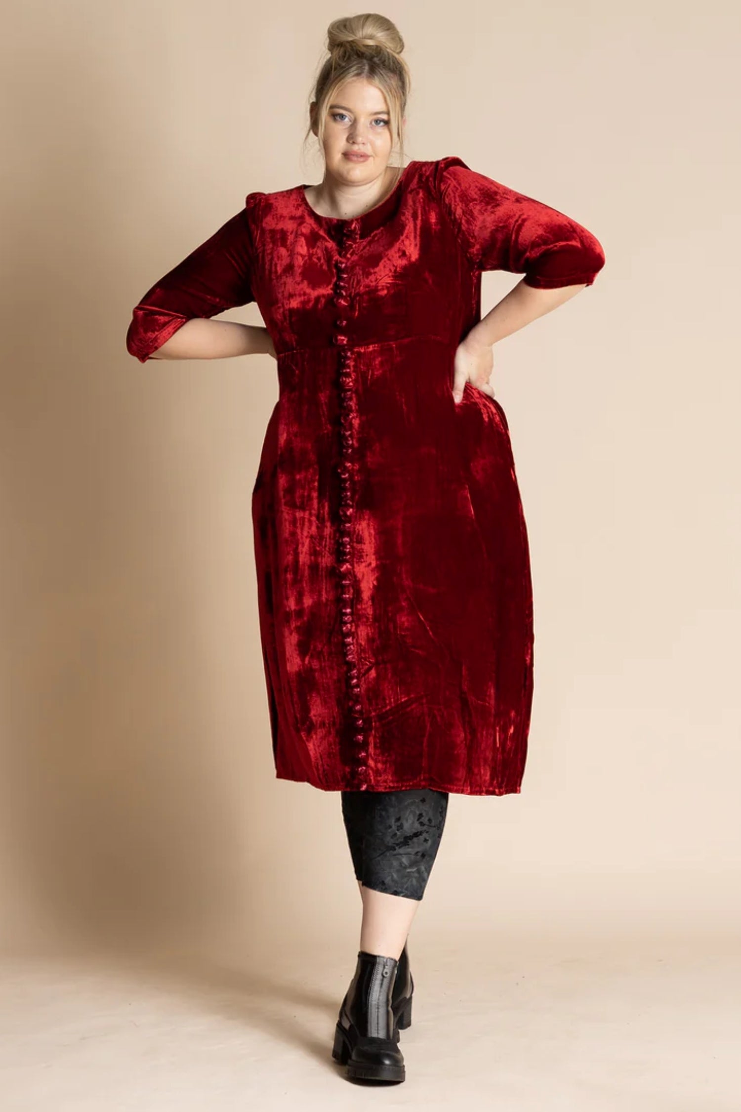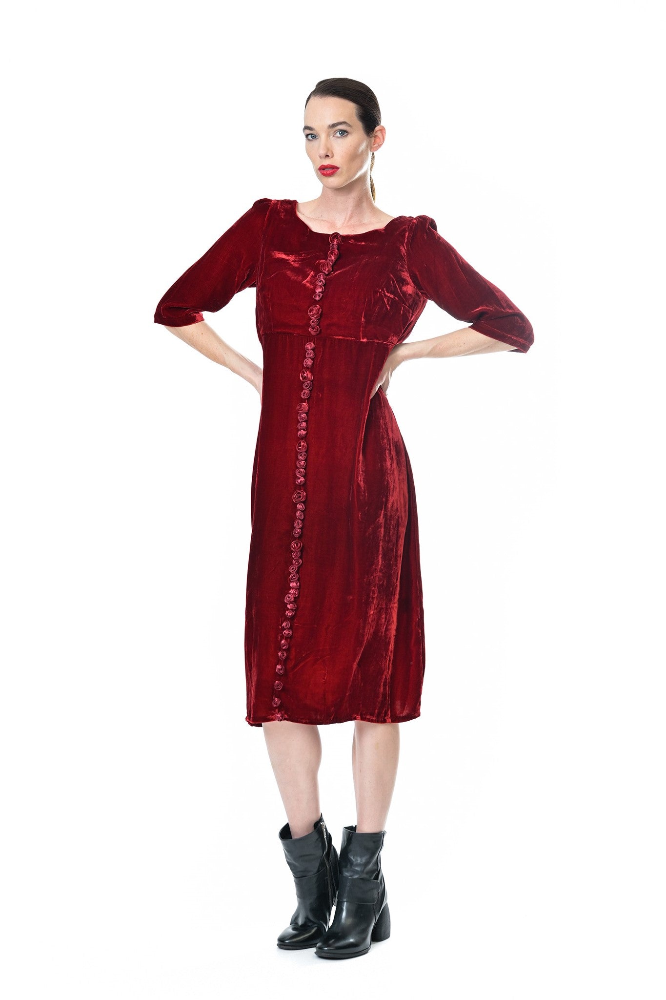 Exquisite and elegant, Megan Salmon’s Velvet Roses Romance Dress is guaranteed to take your breath away. Cut in deliciously soft silk velvet, this elbow length sleeve dress features empire line shaping that looks fabulous on the body. We love the addition of hand cut silk roses through the centre front of this design too!