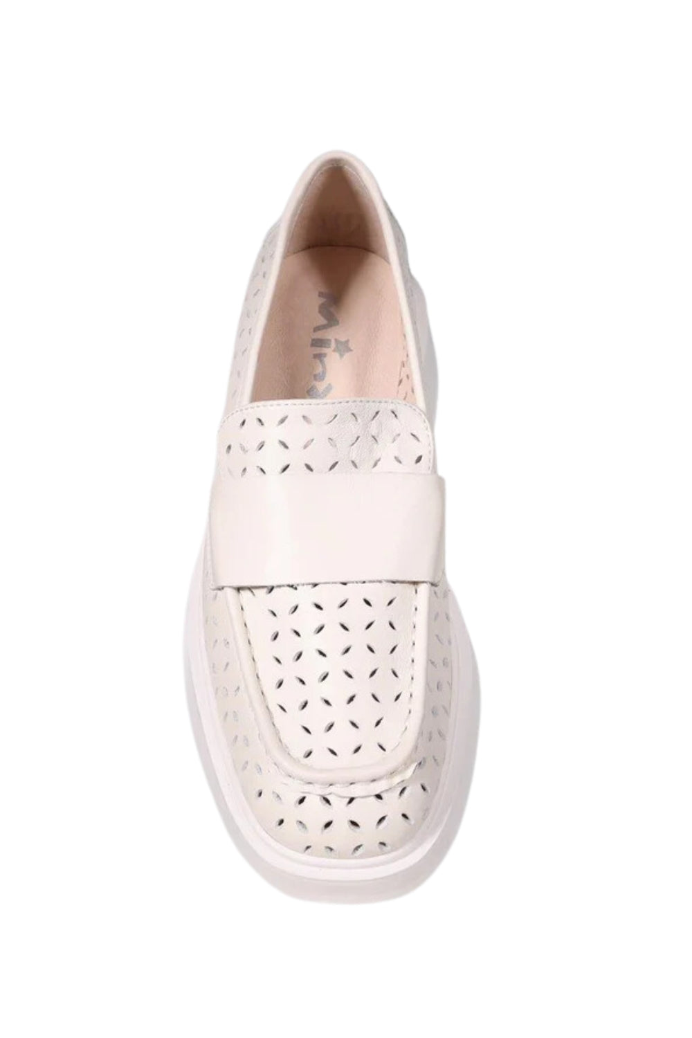 The Minx Calypso Loafer is a timeless leather loafer featuring a soft squared-off toe silhouette, meticulously crafted from soft, supple leather. It showcases elegant leaf pattern perforations for added style. This loafer is set on a soft, flexible rubber sole, ensuring everyday comfort and ease of movement when you're out and about.