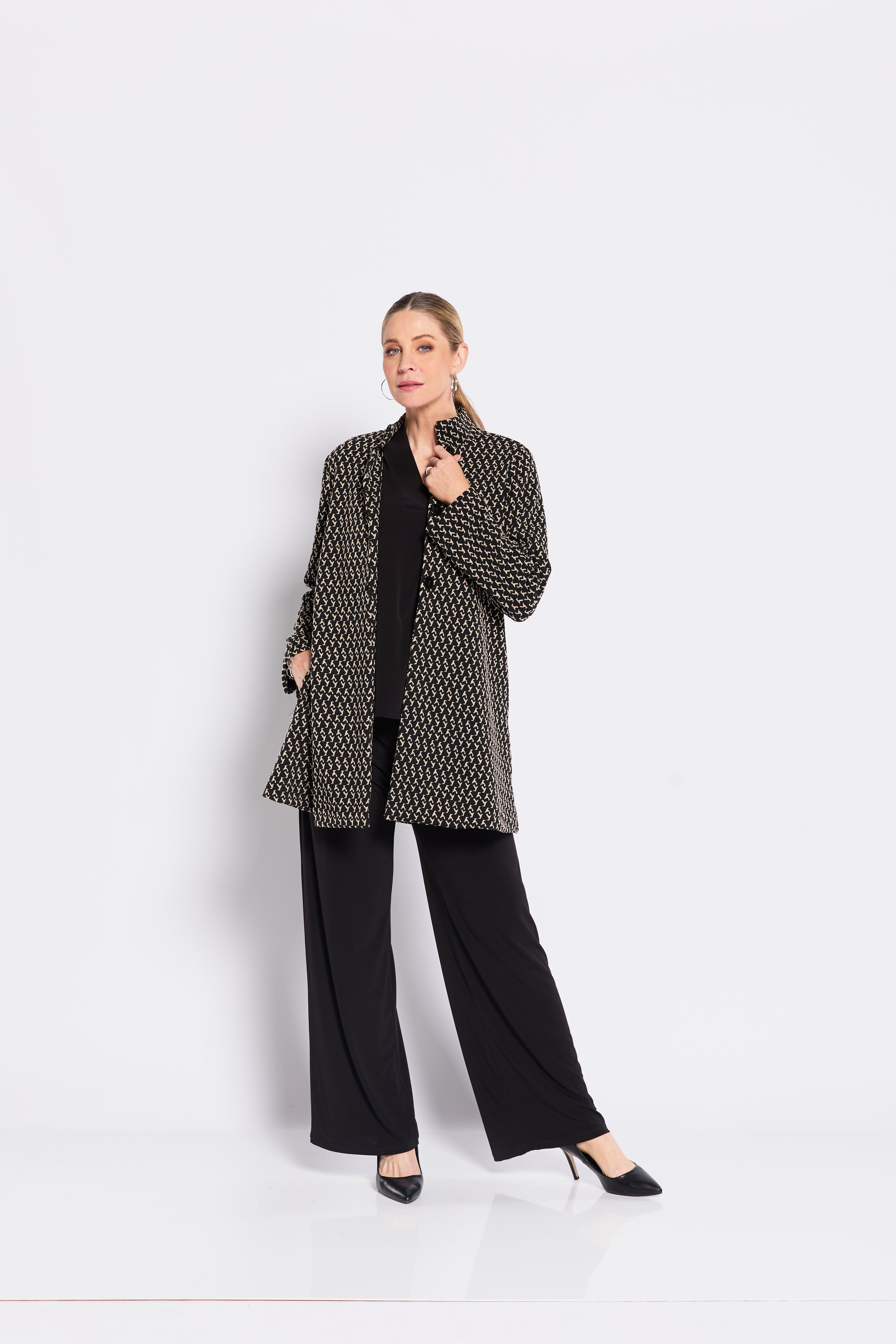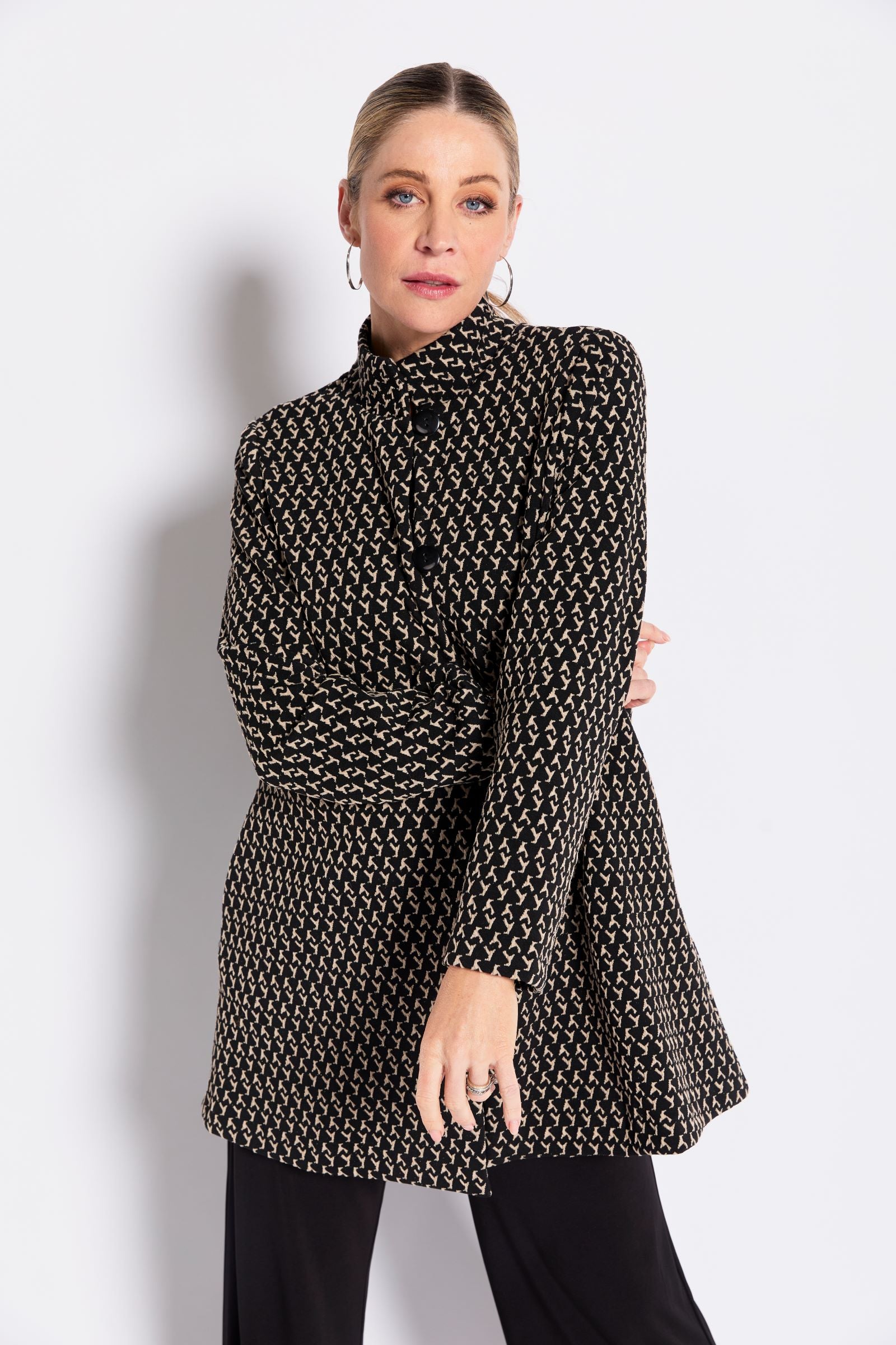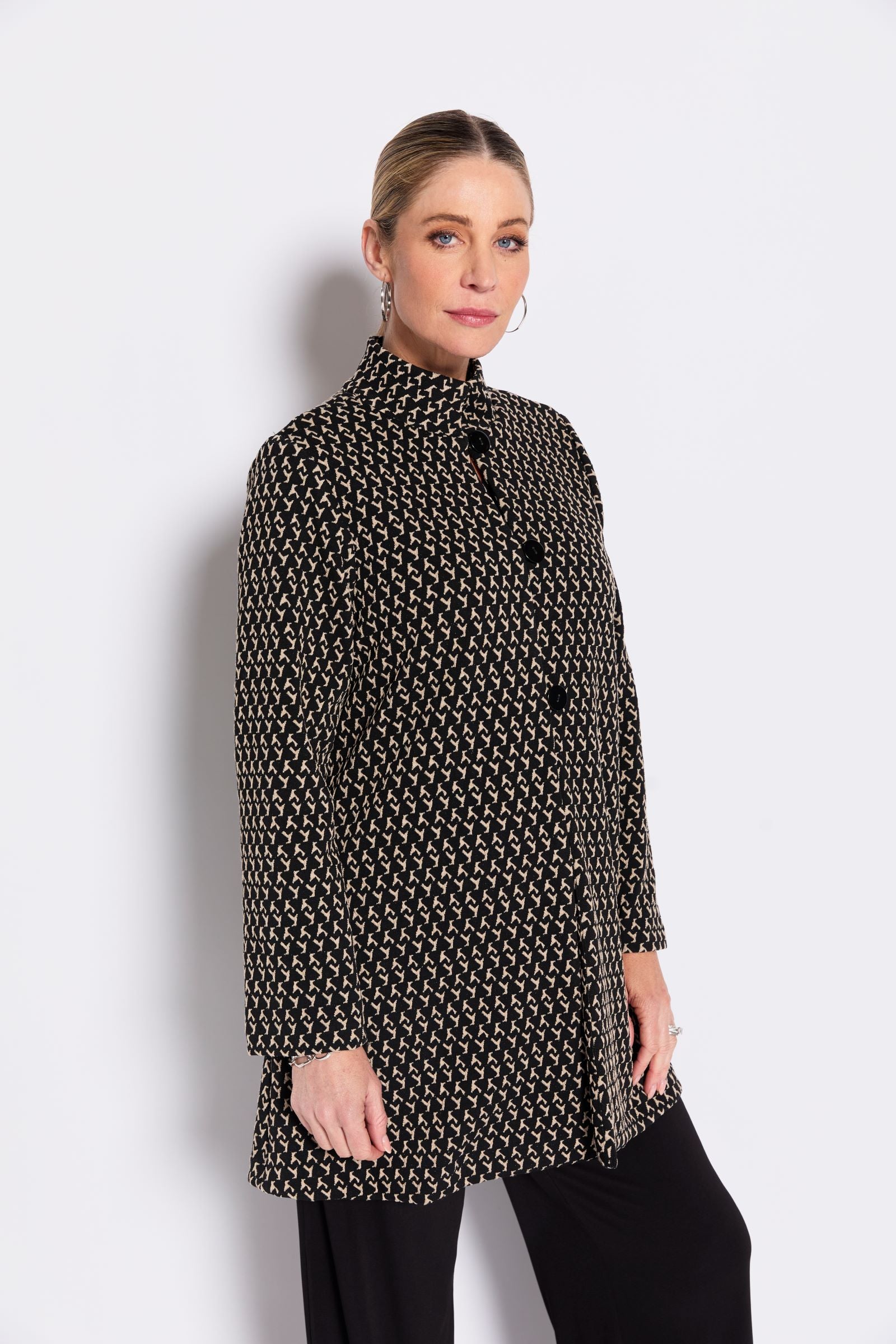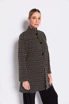 The Karlita Longline Jacket by Philosophy Australia is a modern layering piece with an easy, refined feel. Crafted in a textured knit, this longline jacket features a subtle pattern through black tones, adding depth while remaining versatile. Designed with a soft stand collar and a three-button closure through the upper, it creates gentle structure while allowing the lower half to fall into a relaxed swing shape. Wear it open for an effortless drape or buttoned for a more polished finish. A go-to textured knit jacket that layers seamlessly over everyday looks.