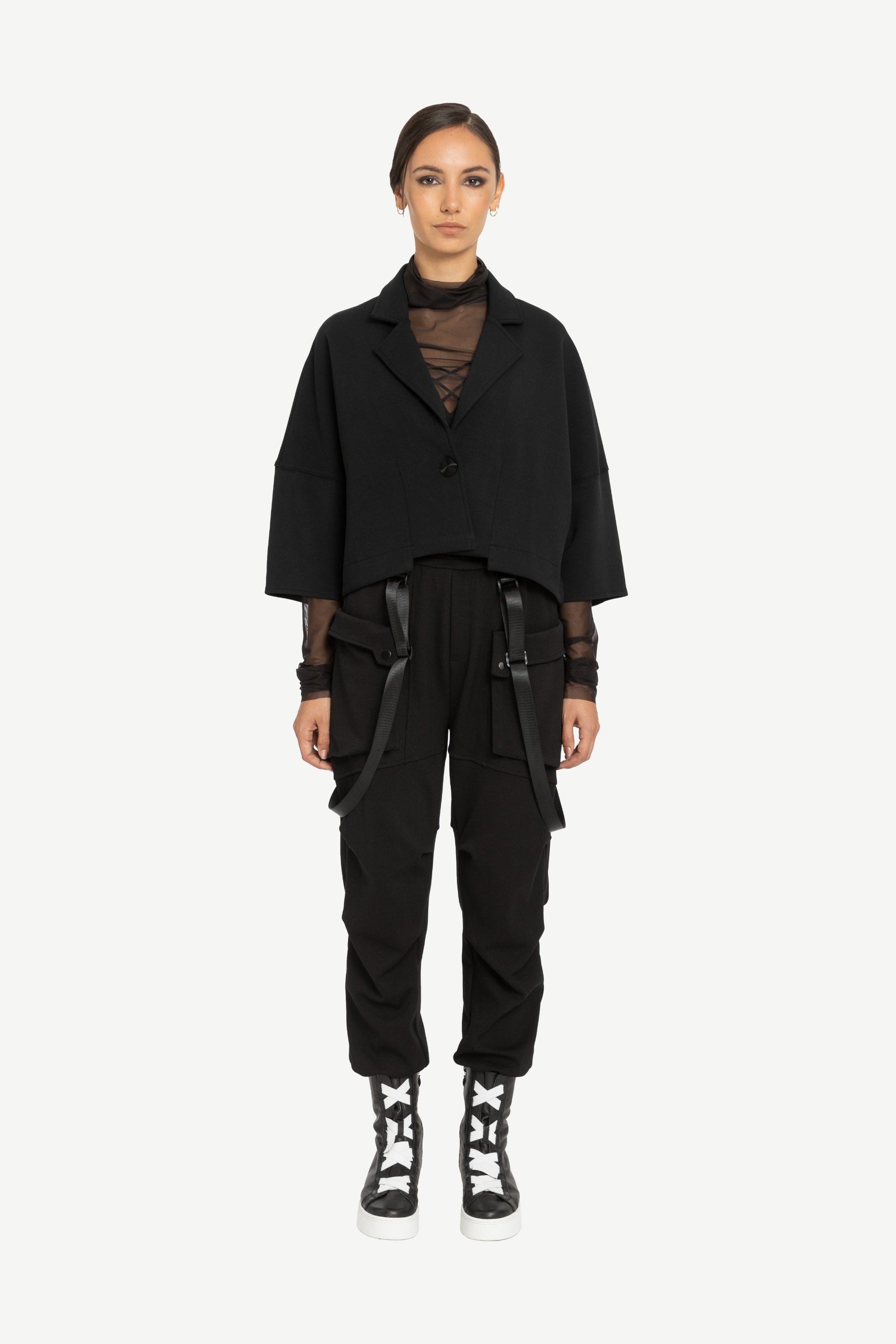 Make a statement in the Sorelle Jacket by Bone and Arrow, a sharp and modern cropped black jacket that brings edge to any outfit. Featuring a boxy silhouette, three-quarter sleeves, and a clean lapel collar, it's the perfect throw-on layer for a contemporary, structured look.