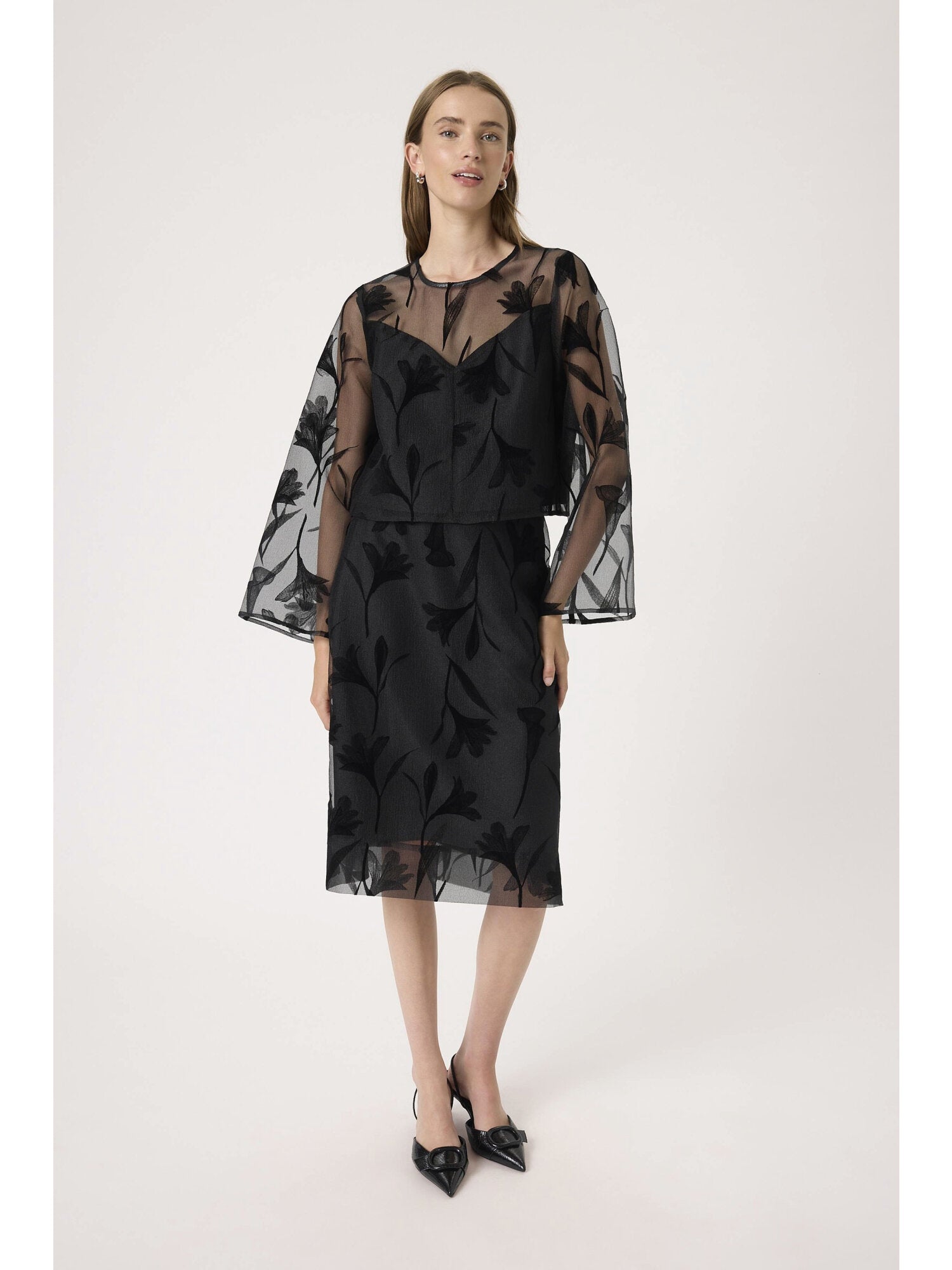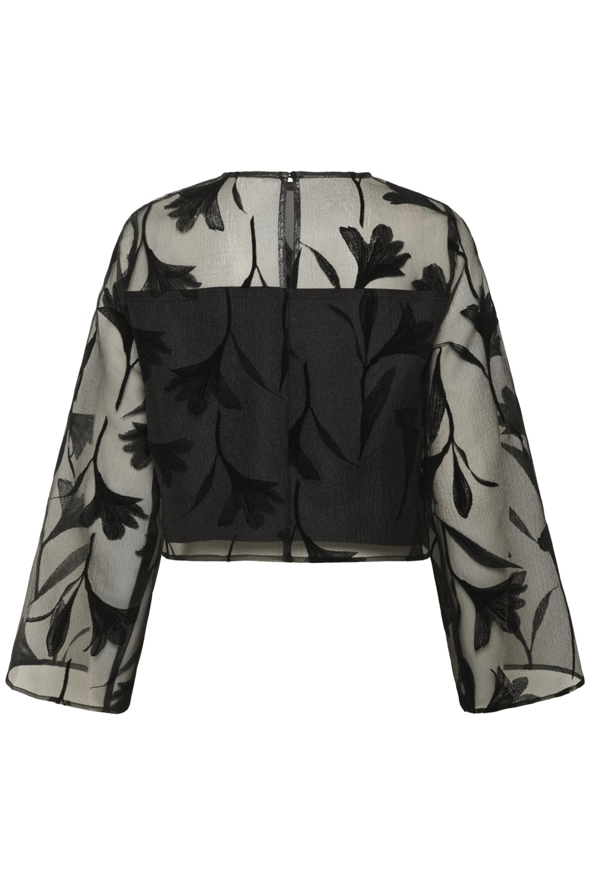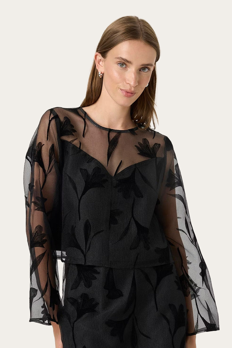 Pair this elegant black sheer blouse with the Philomena Skirt or tailored trousers for a stunning sophisticated outfit.
