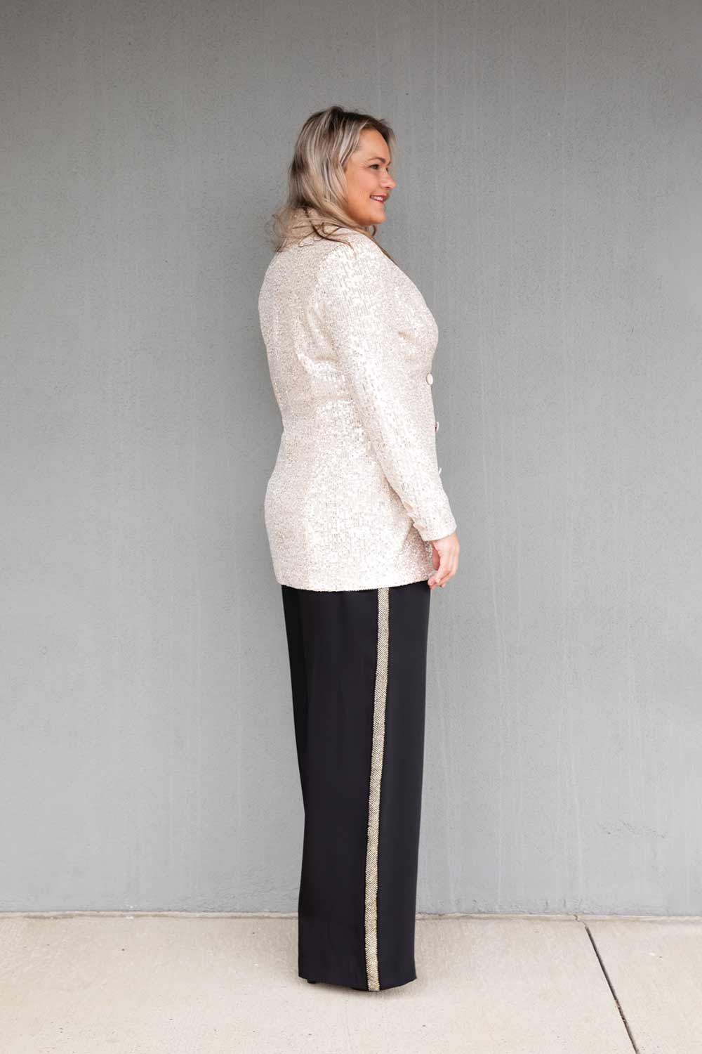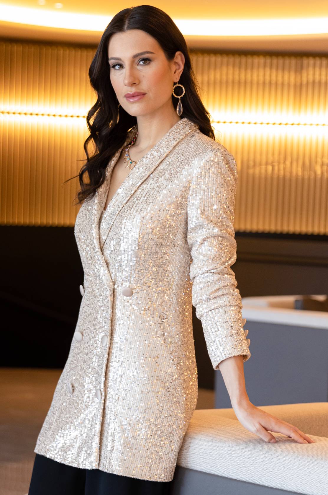 Effortlessly elegant, Frank Lyman's Sequin Blazer is a guaranteed to add a little sparkle to your life! Cut in pale gold all over sequins, this style is fully lined for added comfort and ease of wear. This longline double breasted design works so well with a soft wide leg pant at your next big event, or looks equally as good worn with your favourite denim jeans!