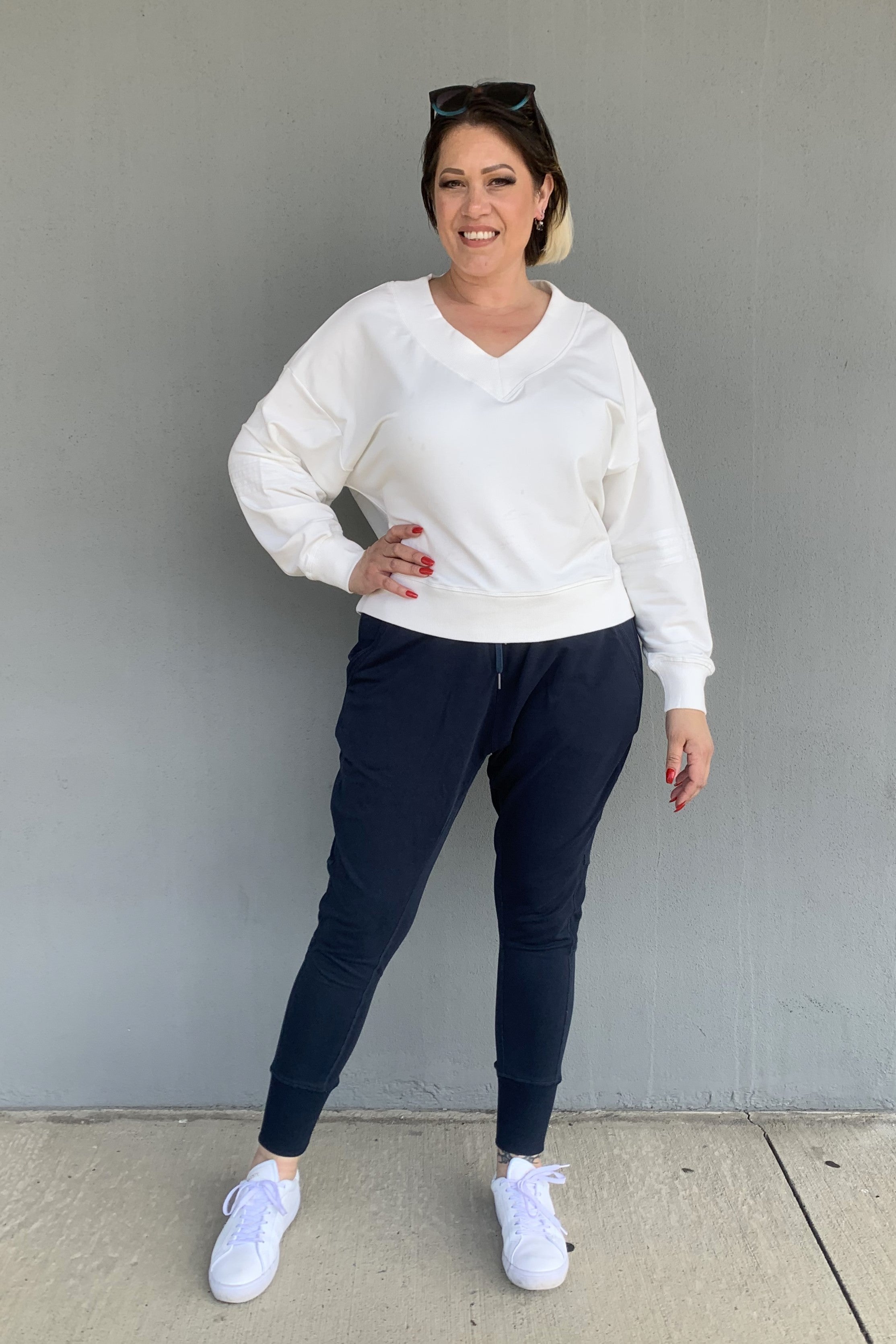 The Dref by D Reese Jumper is simple yet masterfully designed. This sweatshirt is relaxed, featuring a boxy silhouette, wide sleeves cinched down to an elastic cuff and a generous V-neckline. This style is comfortable and flattering to wear, finishing at the hip. We love this paired with the Dref by D Tommio Pant!