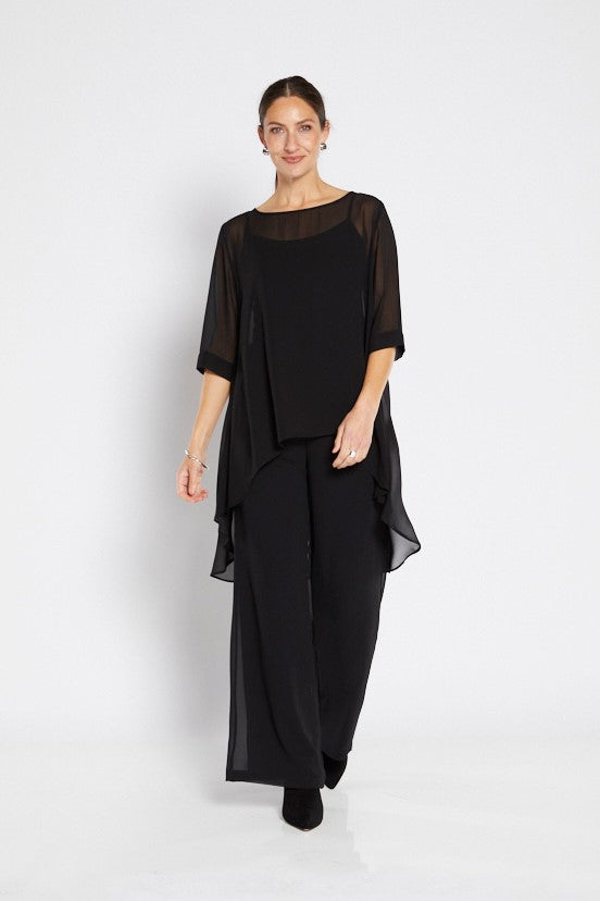 The Ali 3/4 Sleeve Hi-Low Tunic features a relaxed fit with a stylish asymmetrical hem. Perfect for layering or wearing on its own, it offers a chic and comfortable fit. Complete the look with the Philosophy Roma Chiffon Pant.