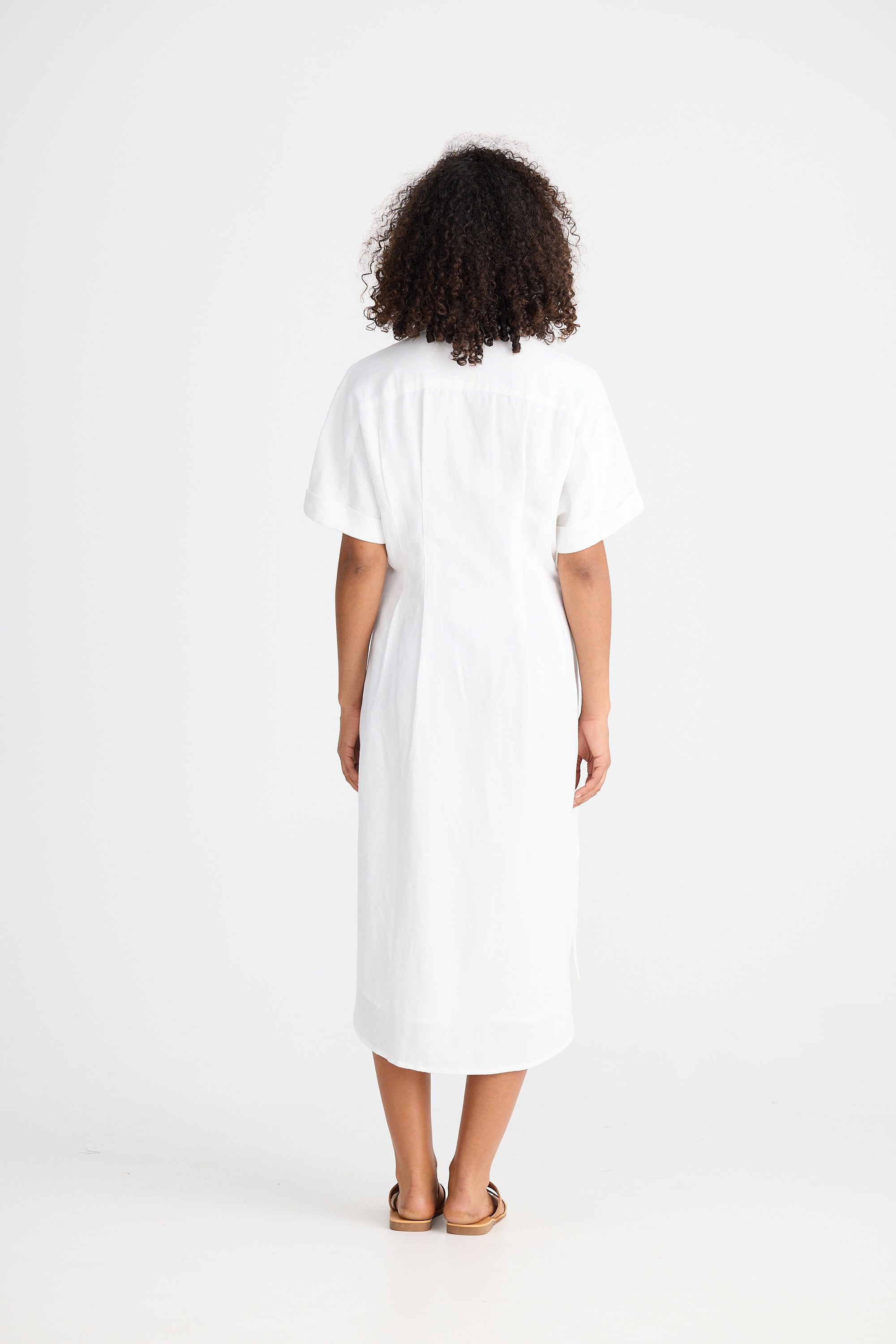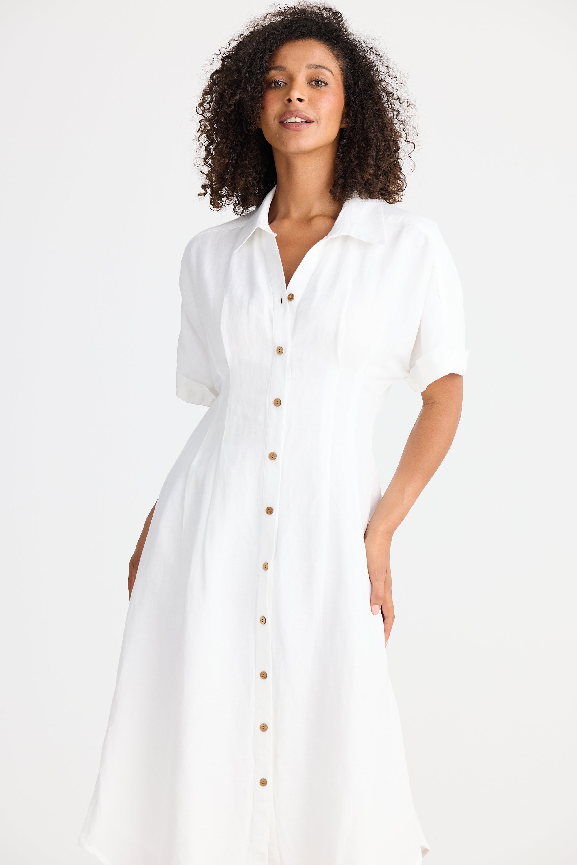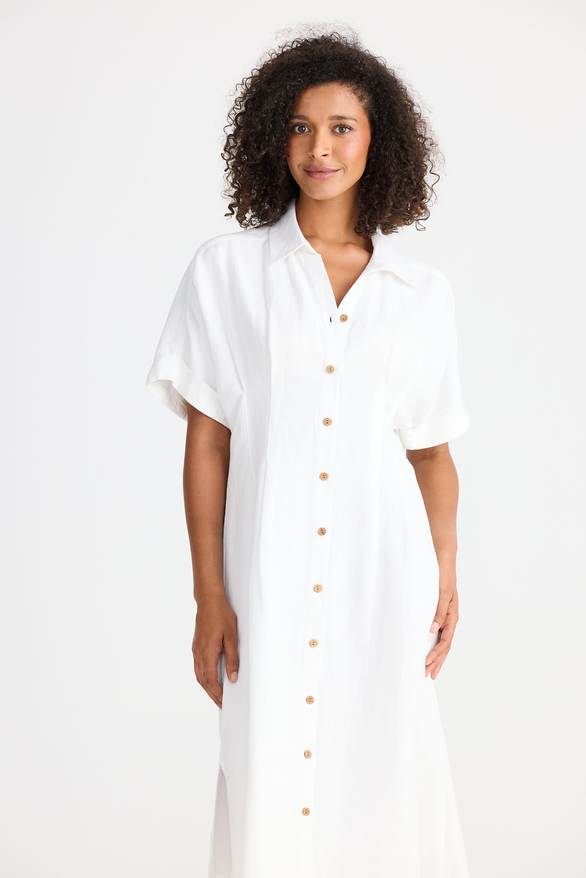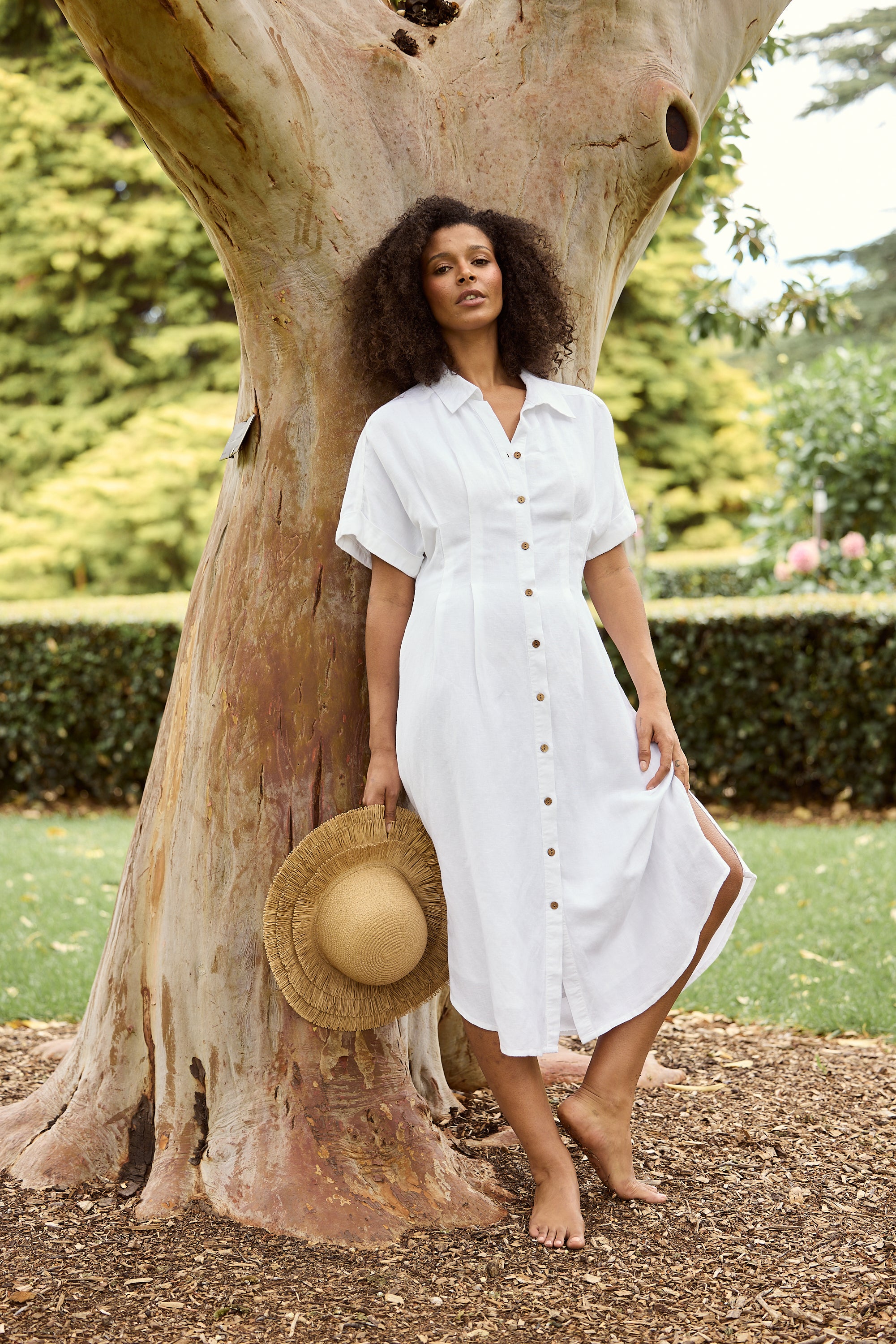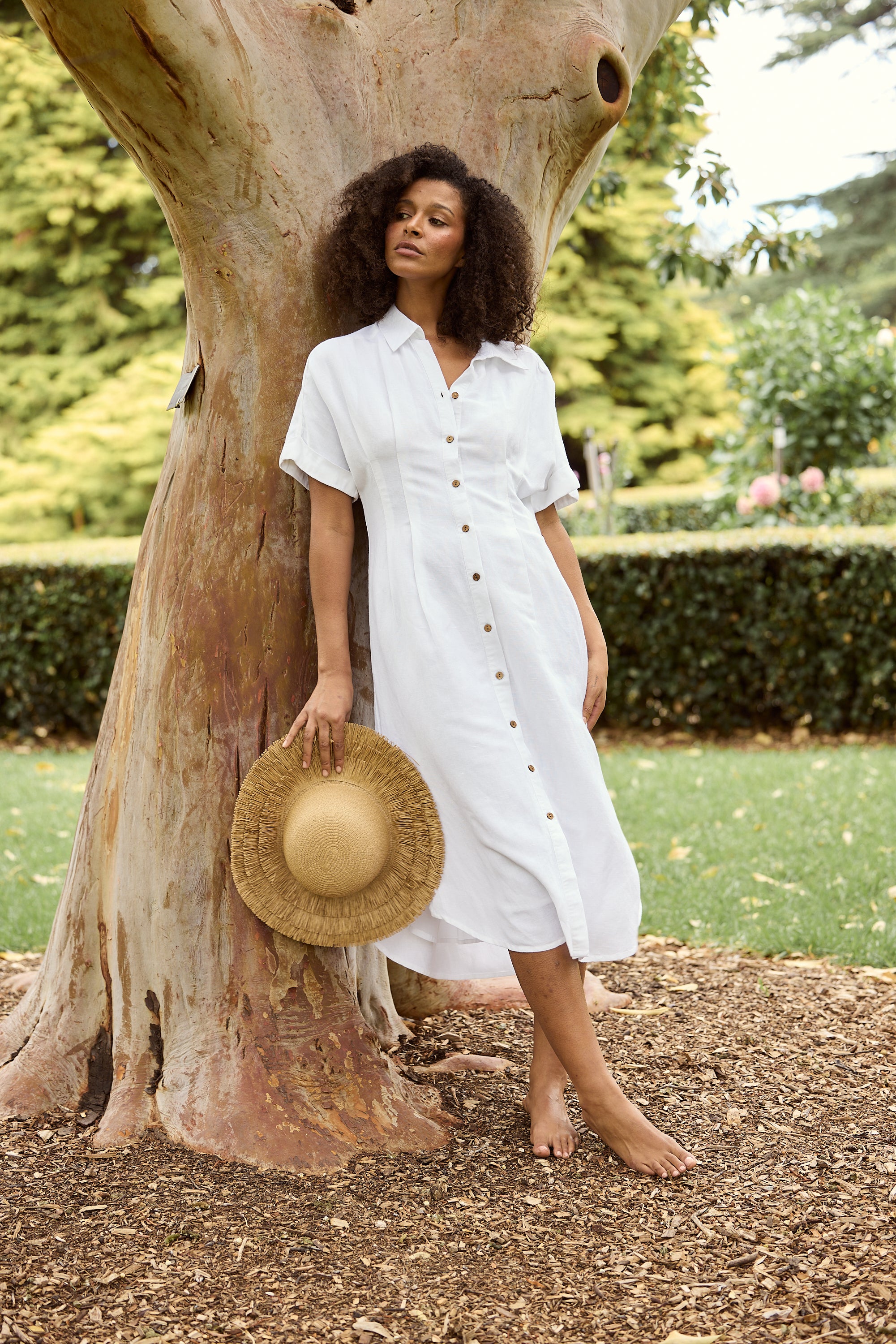 The Felicita Dress is a modern take on timeless sophistication. Crafted from a breezy linen-viscose blend, this button-front midi dress offers effortless elegance with a collared neckline, cuffed short sleeves, and side splits for ease of movement. An inverted pleat at the waist defines the silhouette, while inseam pockets bring practical polish. Fully lined in 100% cotton, it’s comfortable and refined for warmer days. The white hue gives a fresh, crisp finish that works beautifully alone or layered with soft neutrals. Linen-viscose midi dress, button-front white dress, summer collared midi - the Felicita Dress ticks all the boxes for versatile, summer dressing.