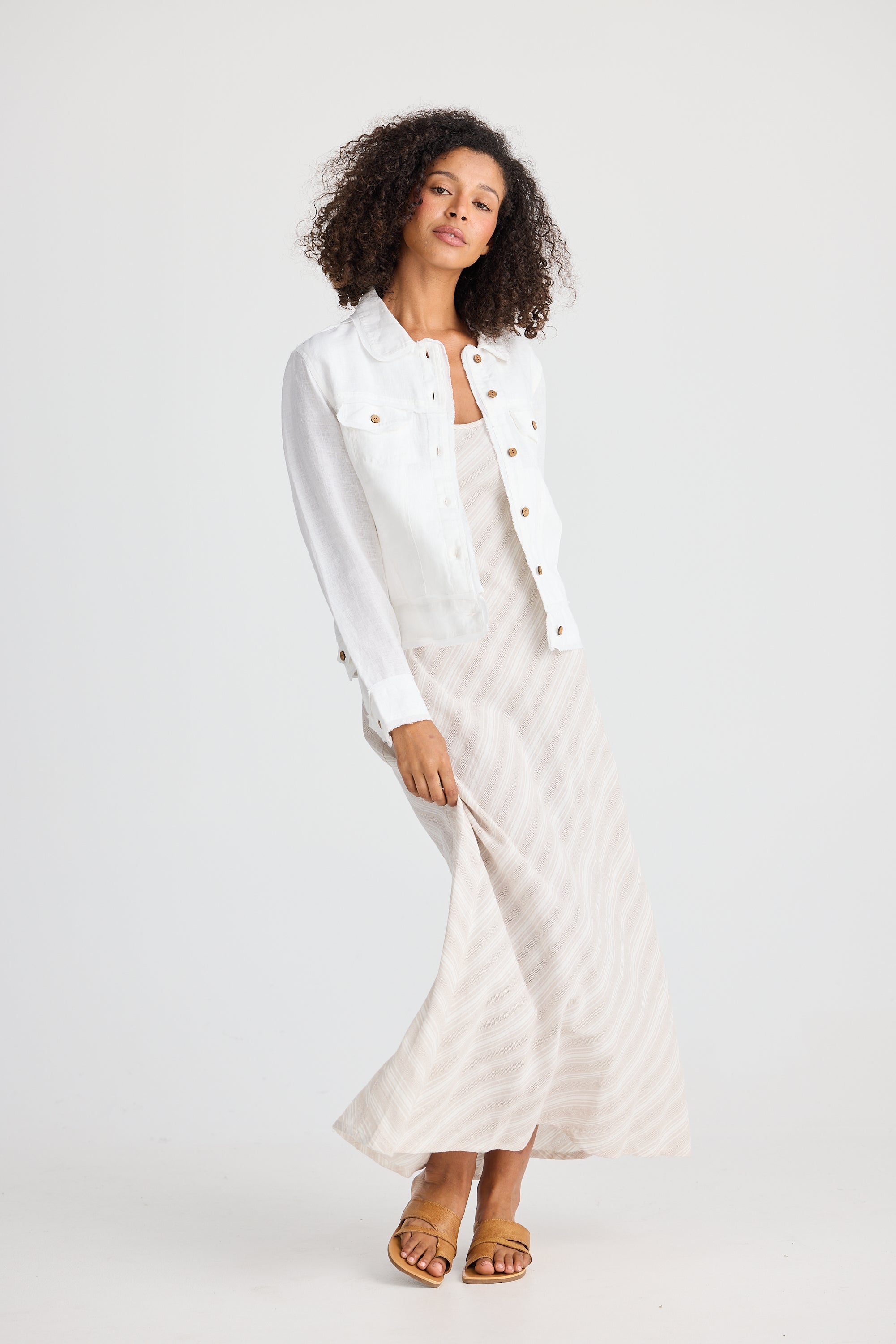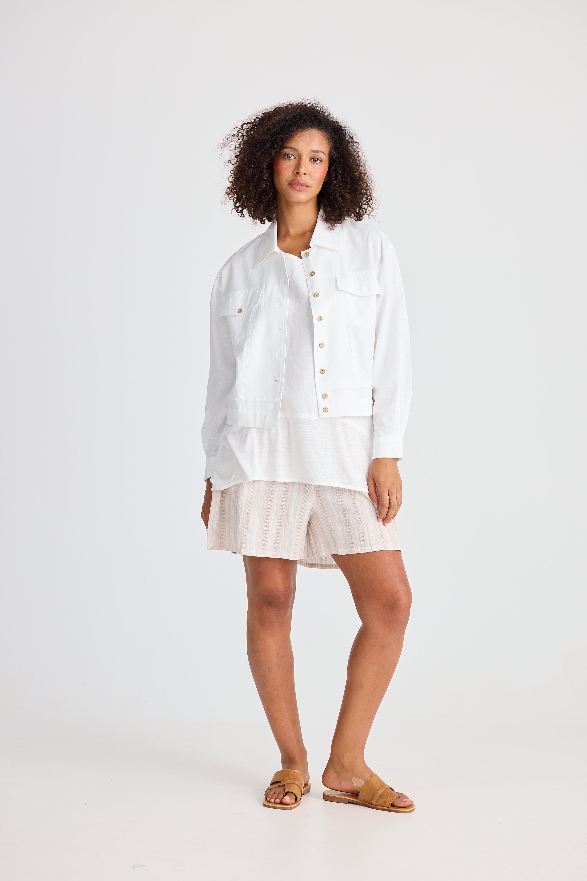 The Roam Jacket is a fresh, modern layer designed to add structure and style to your wardrobe. In crisp white, this cropped jacket features a clean, boxy silhouette with smart front pockets, a raw-edge hem panel and subtle yoke detailing at the front and back for a refined finish. Made from a breathable cotton-linen blend, it drapes cool and effortlessly over everything from dresses to denim - perfect for warmer days when you still want shape and polish.