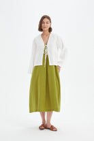 The Tie Front Top by Tirelli is designed with versatility in mind. Featuring a V-neckline, long sleeves, and an adjustable front tie that allows you to style it your way. Wear it closed as a standalone top, or leave it open as a lightweight layering piece over tanks and dresses. With its easy shape and timeless design, this piece is a wardrobe staple that works from season to season!
