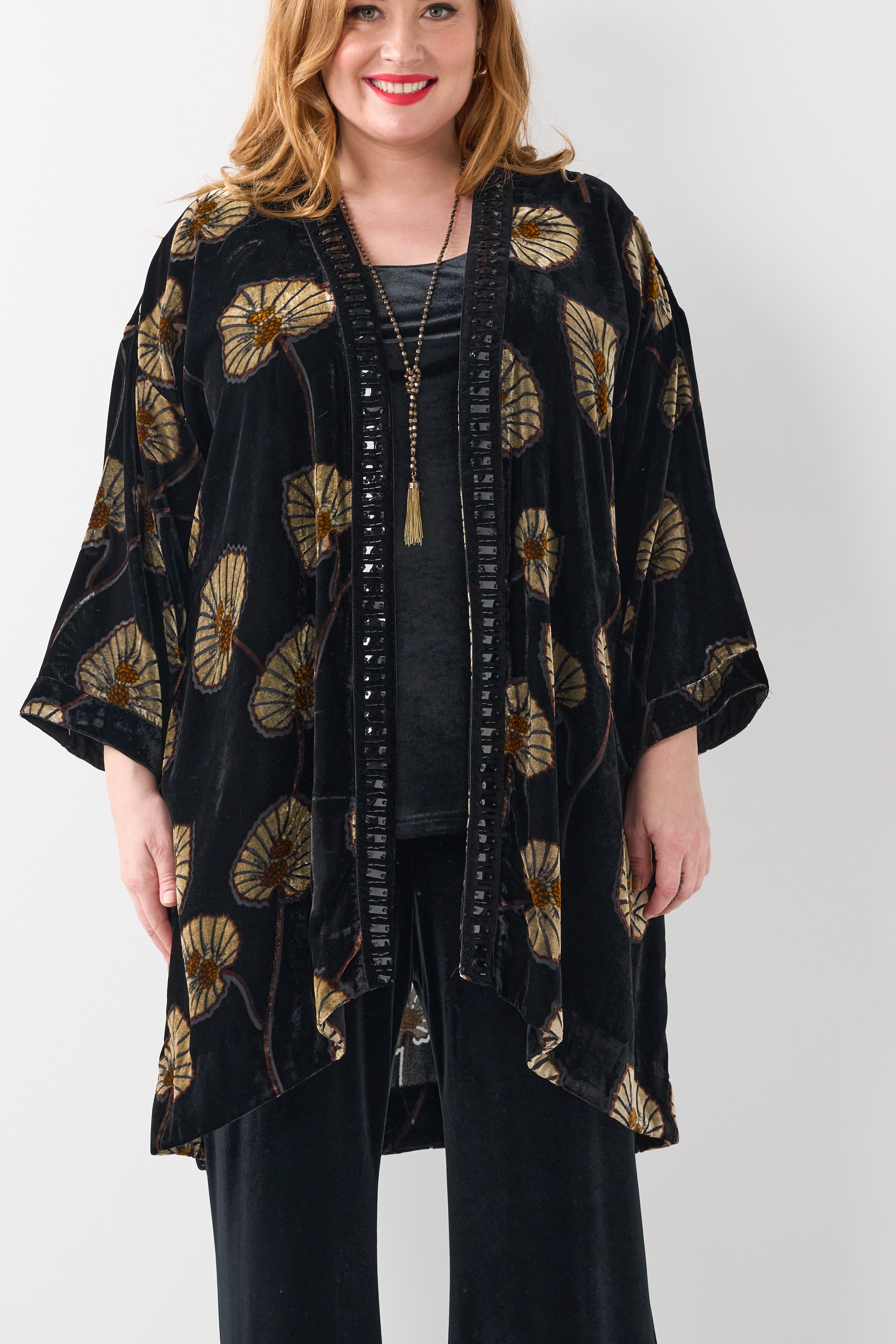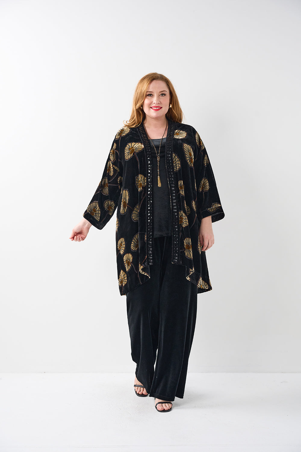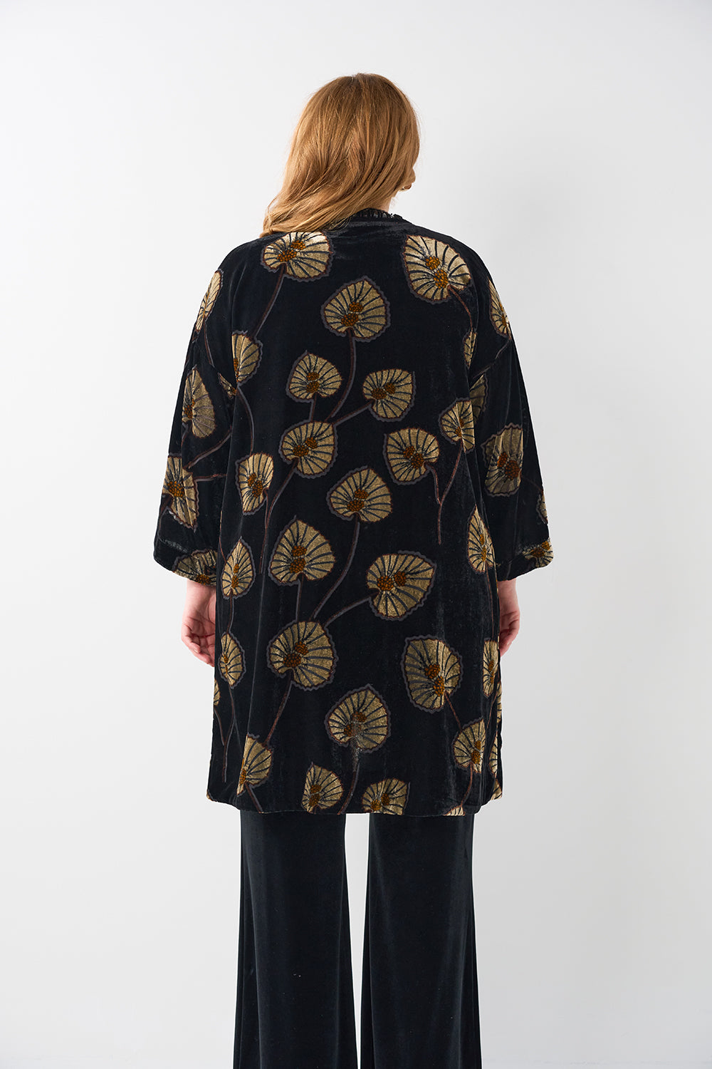Make an entrance in the Swish Golden Lotus velvet evening jacket, a striking velvet evening jacket designed for special occasions. Crafted in rich black velvet with a layered burnout finish, this black and gold statement jacket features an intricate lotus motif that brings depth, texture and refined glamour.