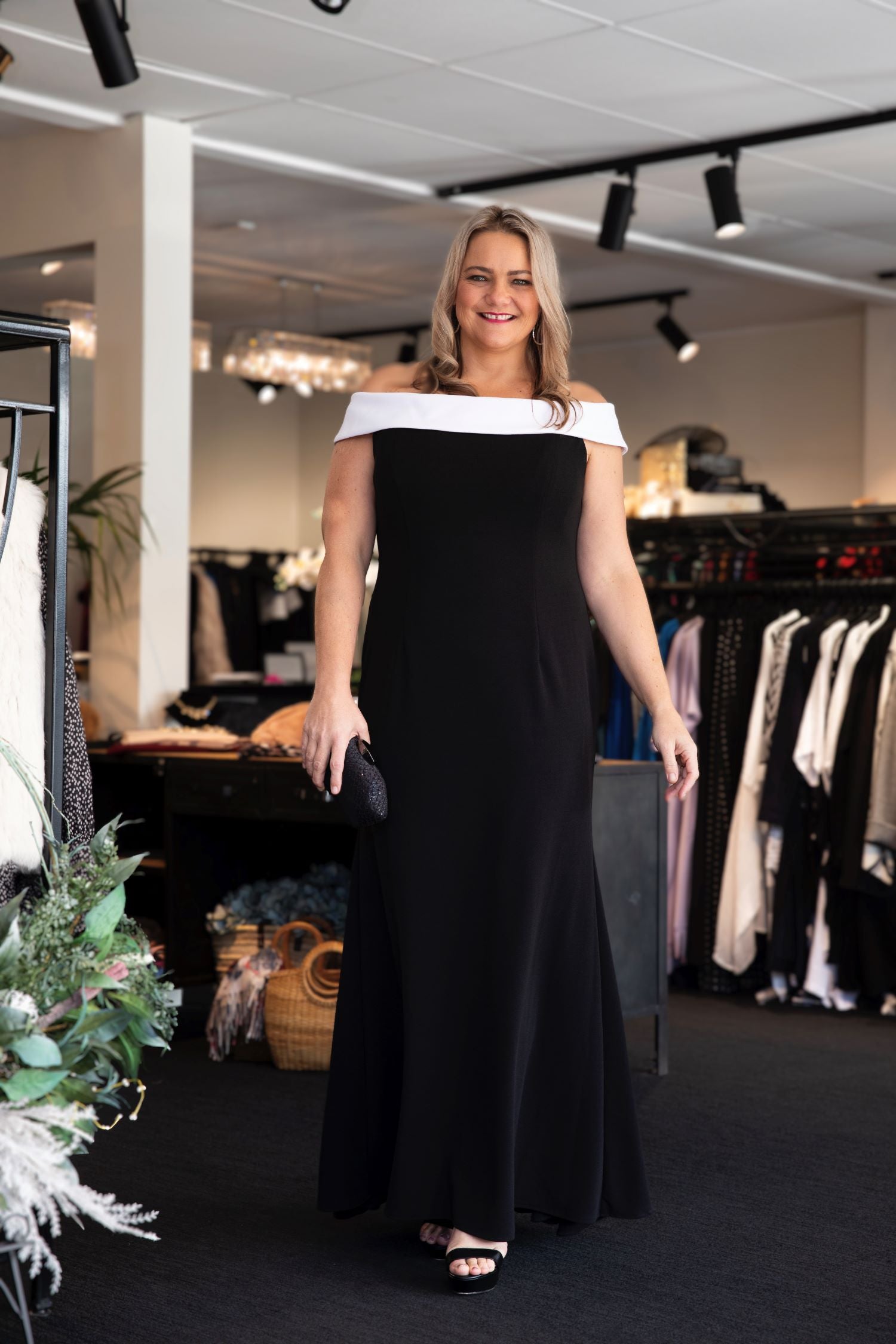 Modelled after the ethereal Kate Middleton, feel like a princess in the gorgeous Kate Gown by Zaliea. Fittingly named princess Seams allow this full length gown to contour to your body. Regal in black with contrasting white, this fully lined style has built in bust support so you can wear this off the shoulder style with confidence and grace.