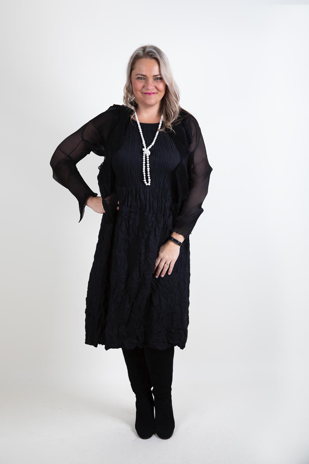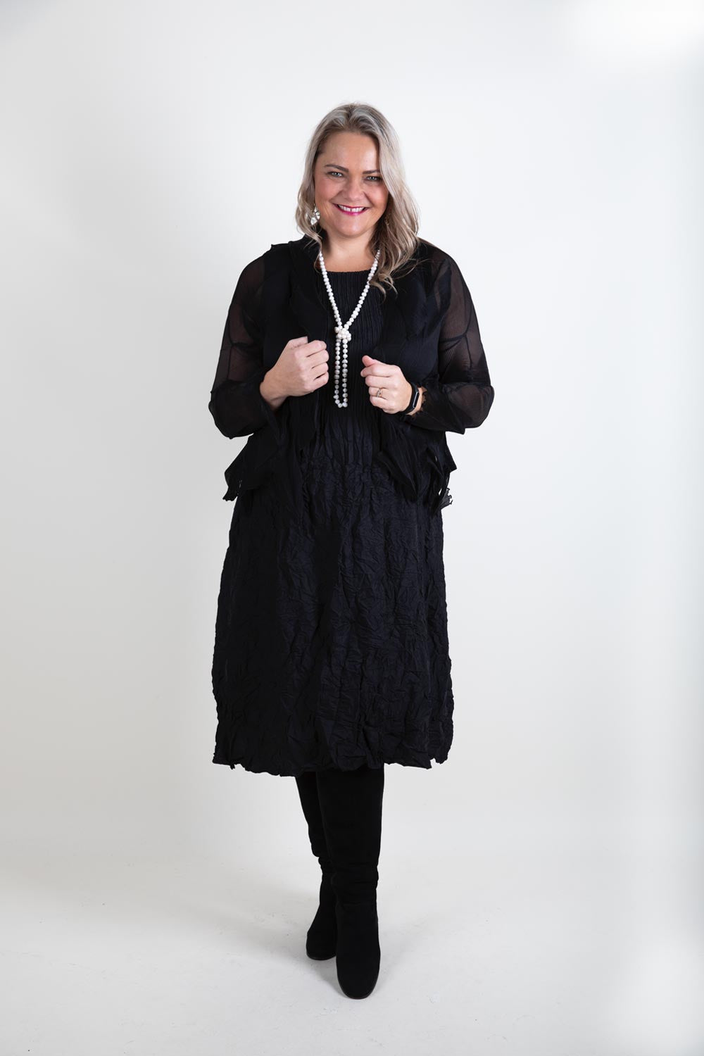 Alquema designs utilise intricate shibori pleating techniques to dramatic effect. The Jacqui Bolero is a shorter proportioned edge to edge style with higher neckline and full length sleeve. Offered in Charcoal and Black, this design works as striking sleeve cover that pairs perfectly with Alquema’s Estrella Dress.