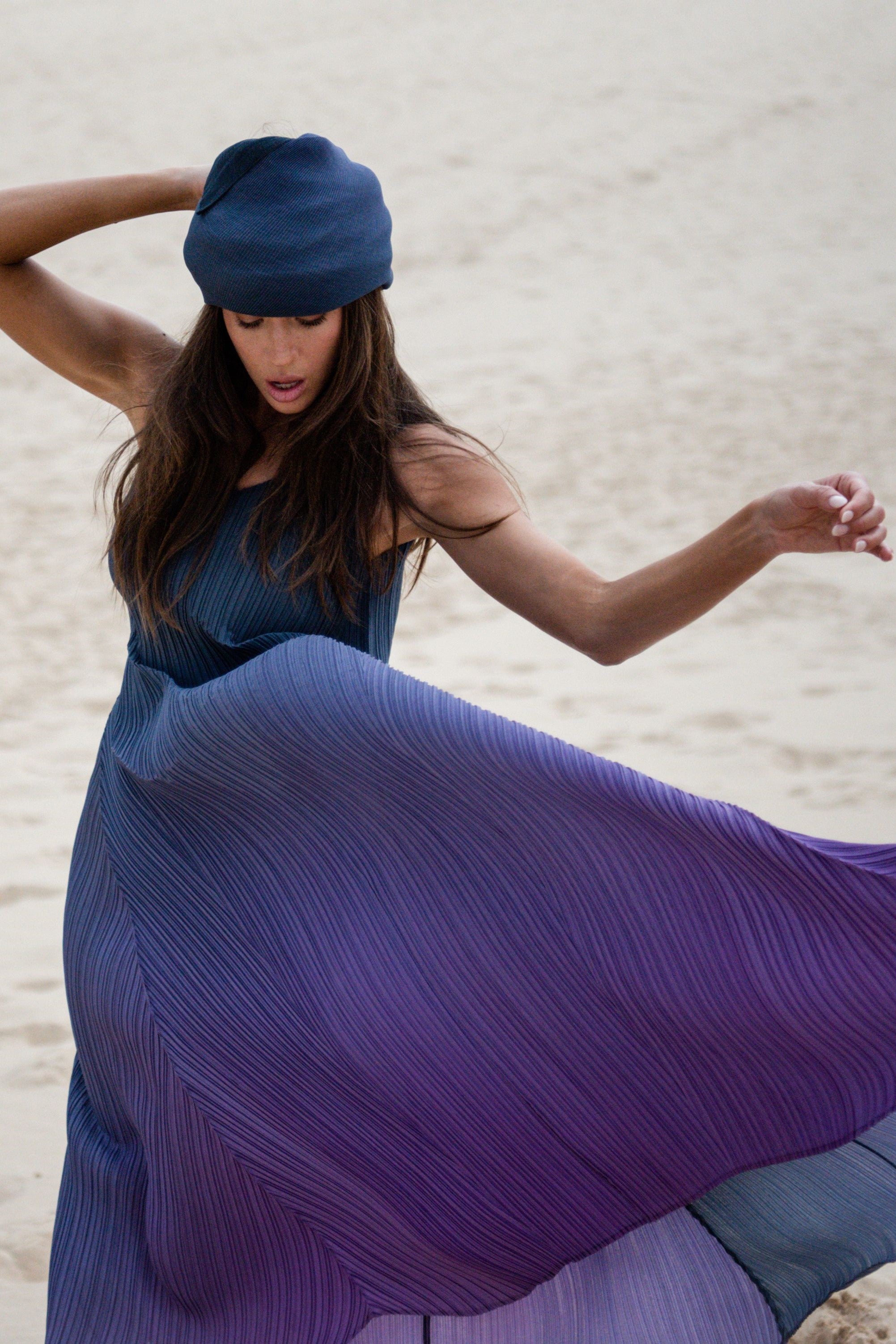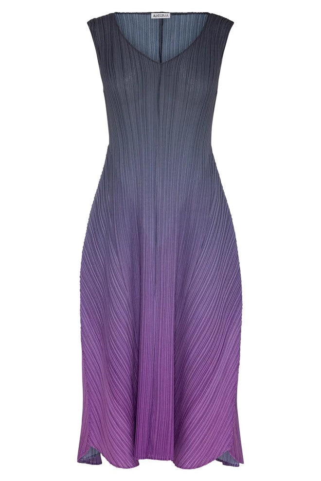 Cut in an intricately pleated fabrication, this sleeveless dress features a Vee neckline and cocoon shaping. Team with the matching Collare Coat at your next big event! This style is offered in more stunning colourways which you can find here, each featuring exquisite ombré styling or incredible patterns.
