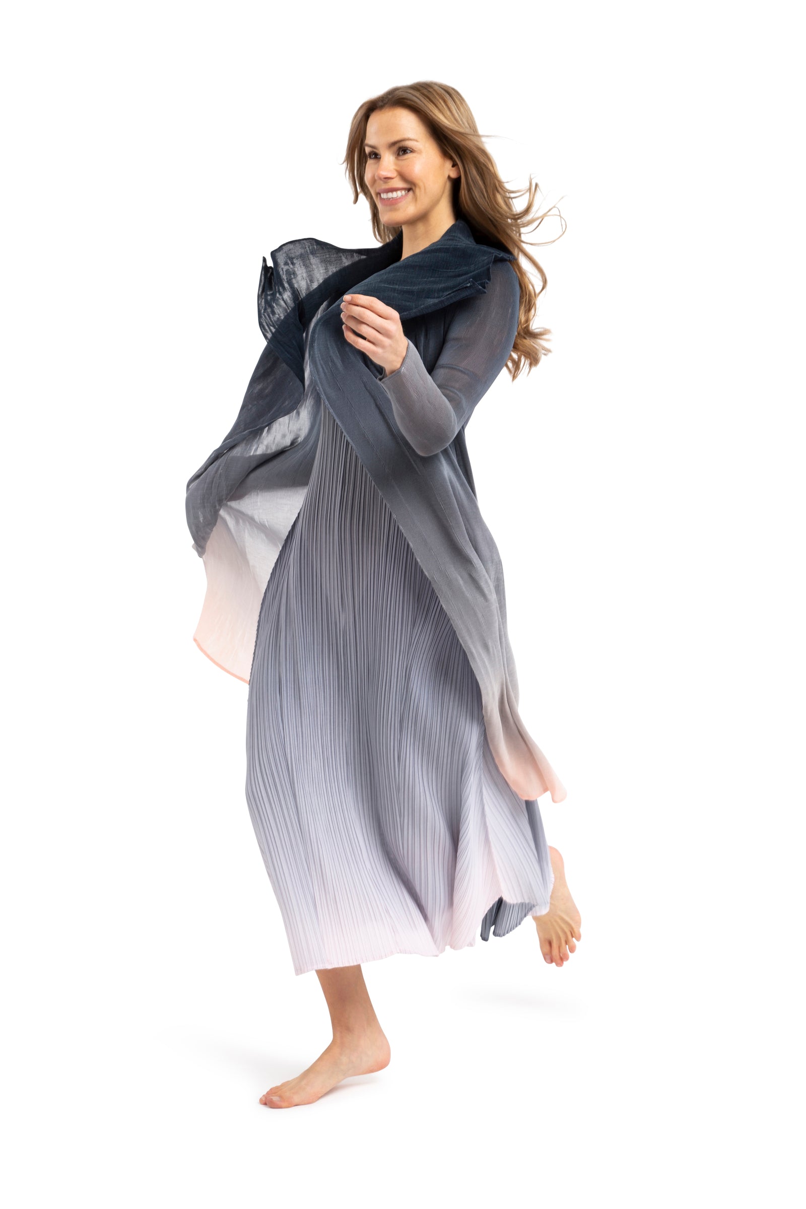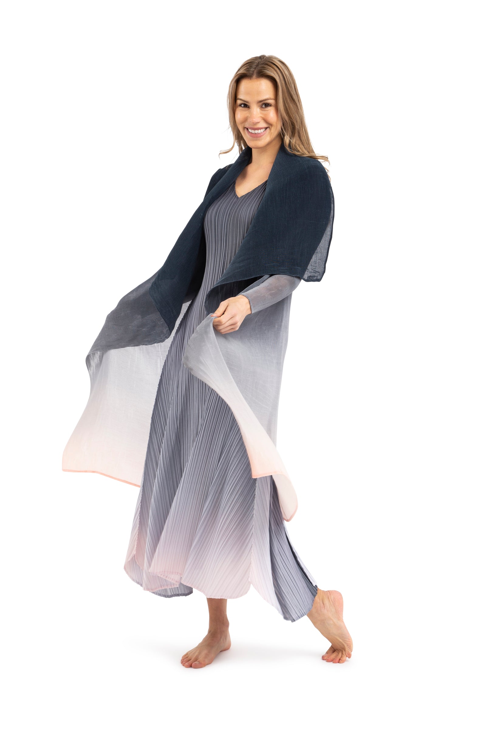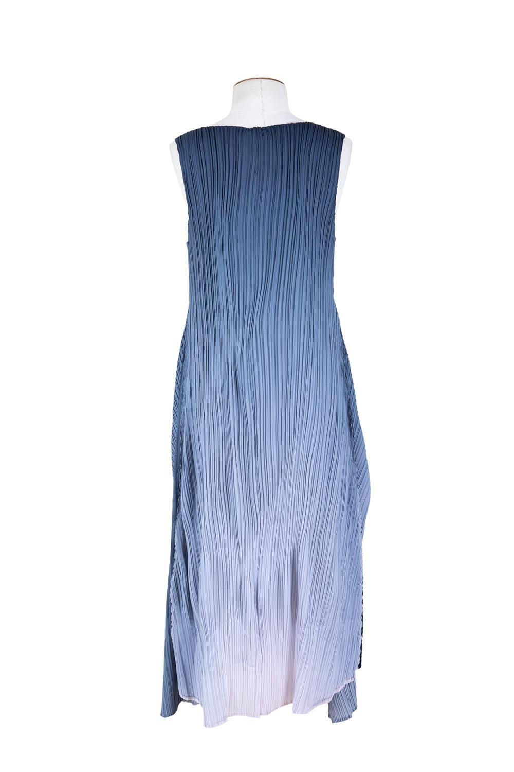 Cut in a intricately pleated fabrication, this sleeveless dress features a Vee neckline and cocoon shaping. Team with the matching Collare Coat at your next big event! This style is offered in more stunning colourways which you can find here, each featuring exquisite ombré styling or incredible patterns.
