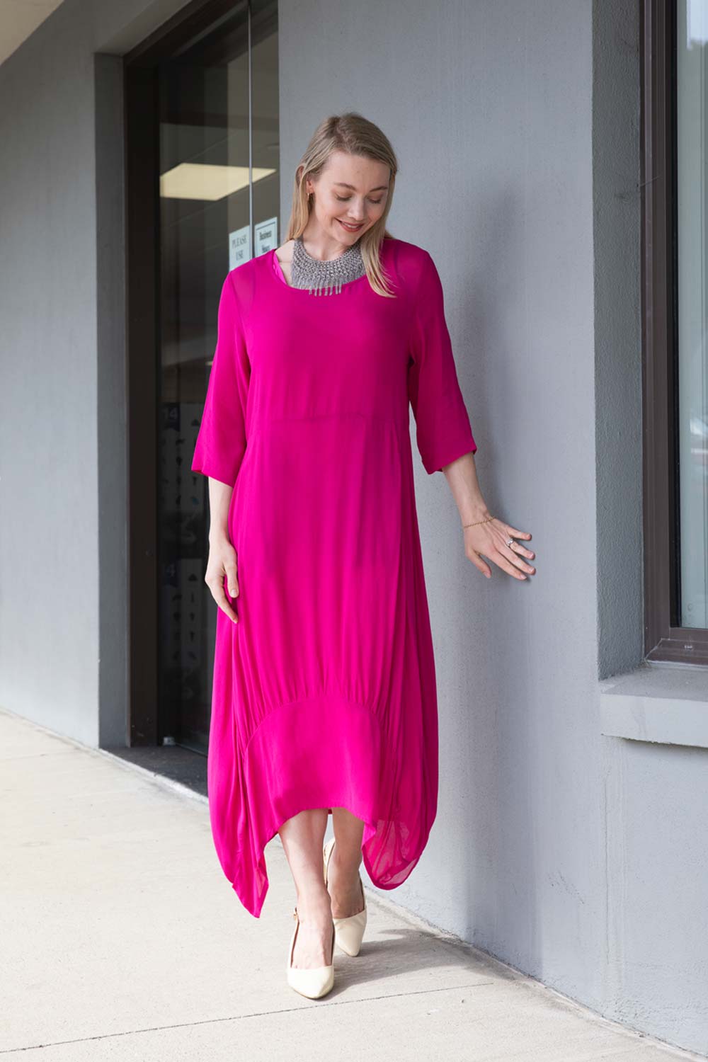 Proudly made in New Zealand, and created exclusively for Magazine, the Bittermoon Miracle Dress looks fabulous on the body! Cut in a semi sheer viscose, offered in Forest and Pink, this crew neck, elbow length style offers soft cocoon shaping and a wide band at the front hem. With the added bonus of front pockets, team with the matching Ava Slip at your next special event!