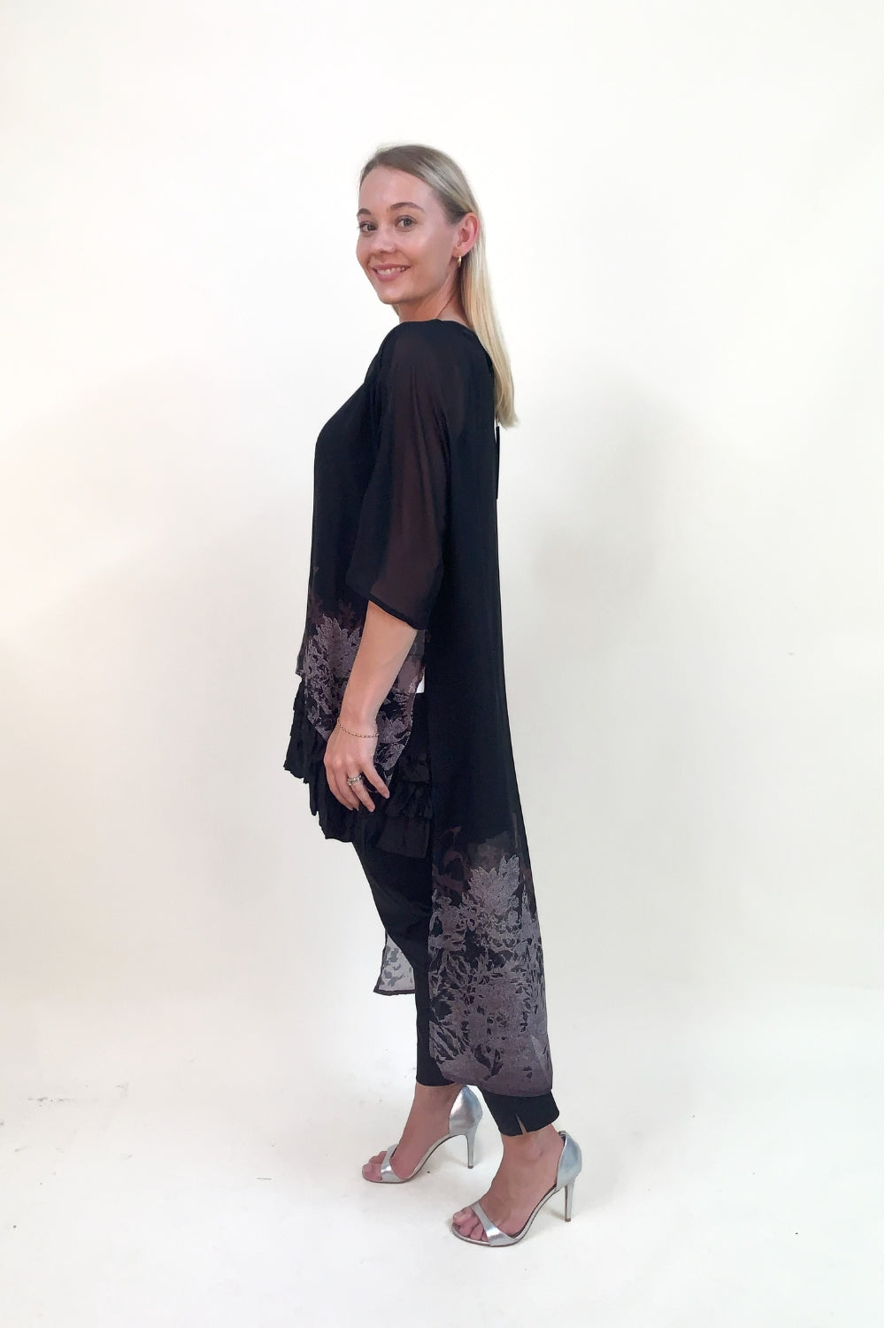 Elegant and dramatic, the Ever Sassy Falling Leaves High Low Top is perfect for layering. Cut in a semi-sheer fabrication, this style is light and flowy making it easy for trans-seasonal wear.