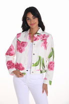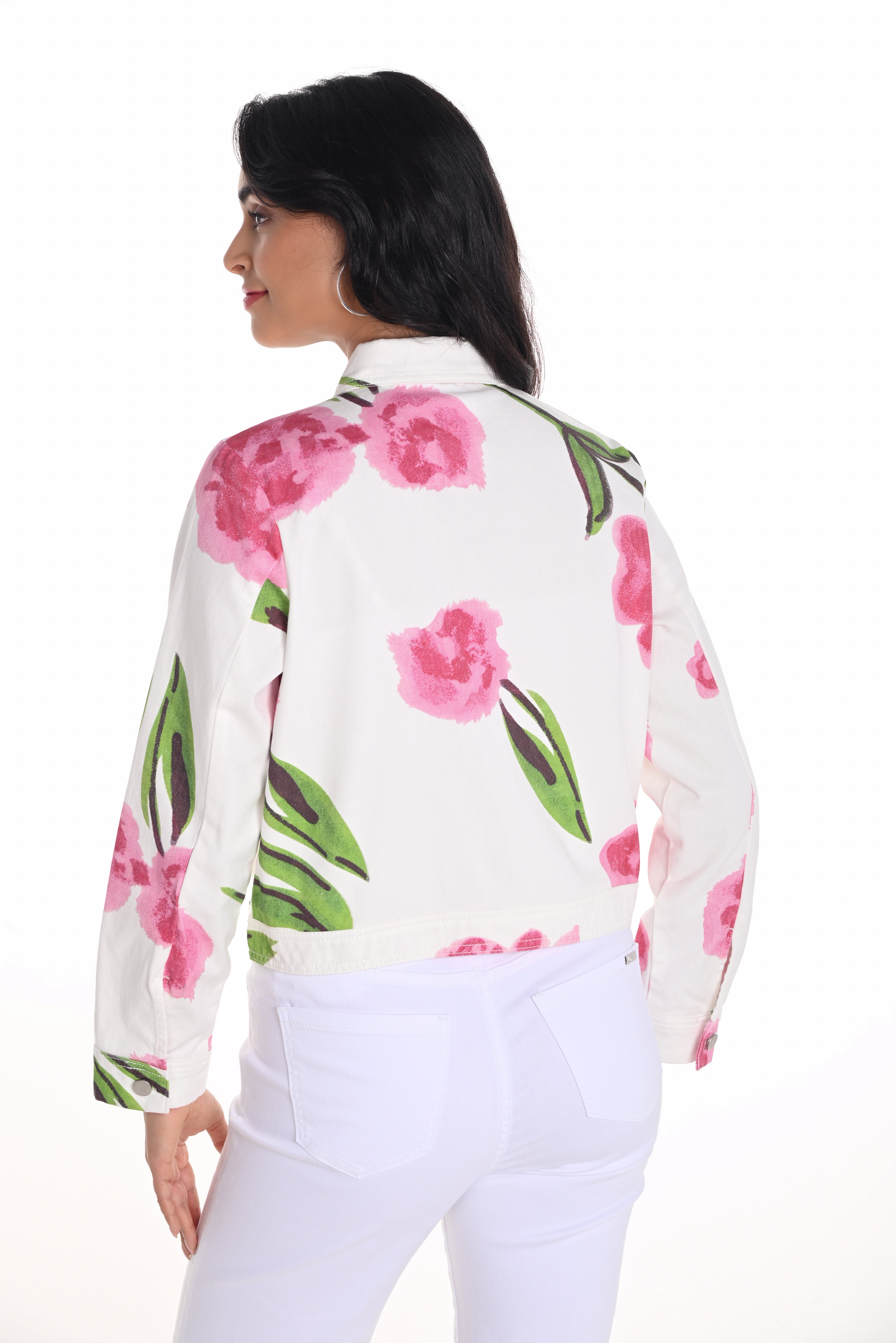 A fresh and vibrant take on a classic denim jacket, the Floral Printed Jacket from Frank Lyman features a clean pink and green large floral print. With silver hardware and a white base, this jacket is collared with long sleeves. Perfect for adding a pop of colour to your everyday look!