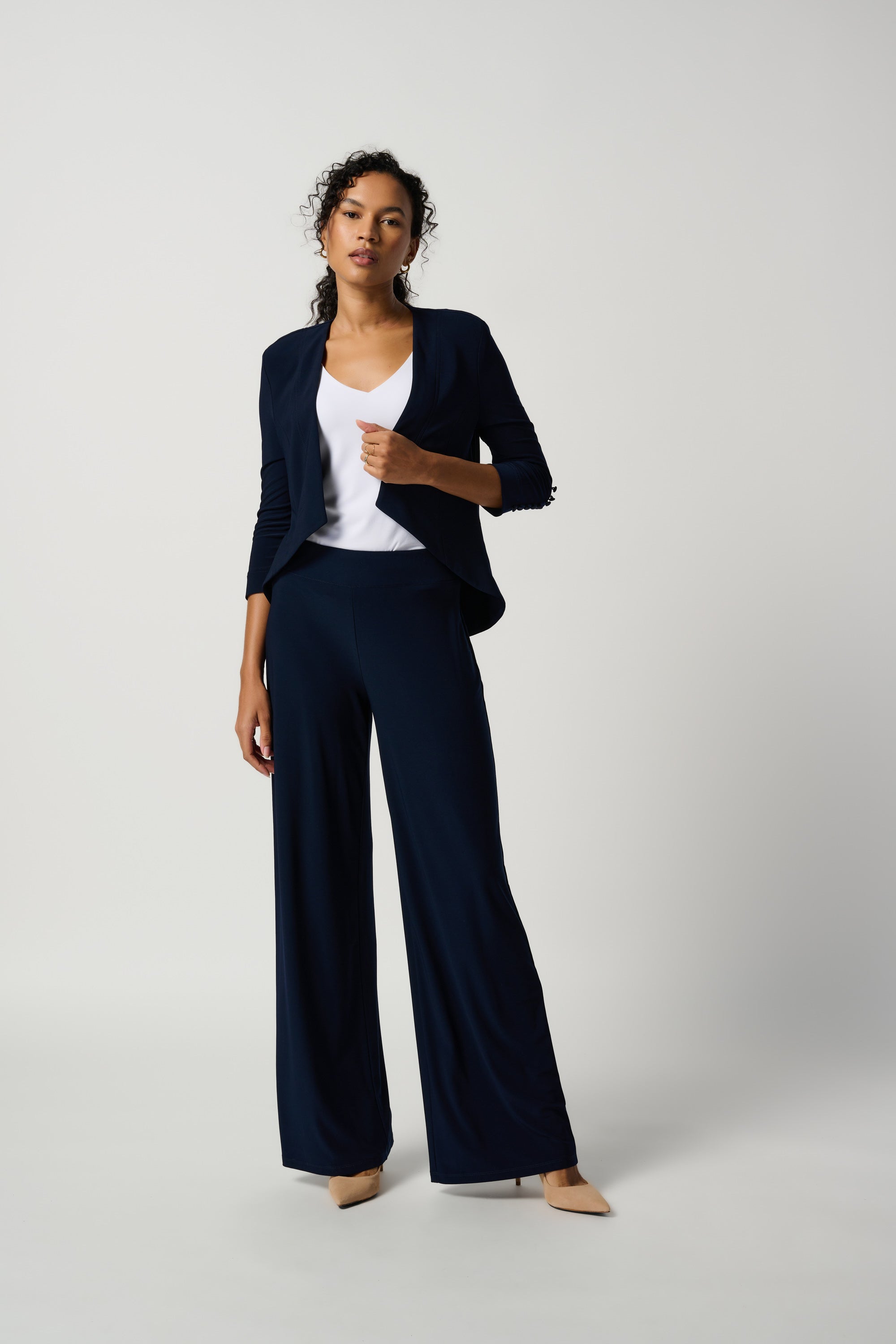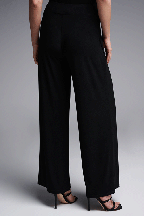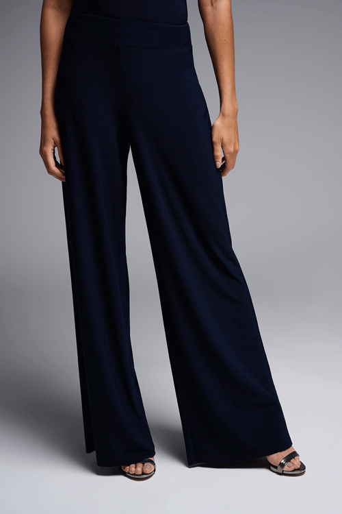 Joseph Ribkoff's designs are renowned for their quality long lasting fabrications and their fabulous fits. Cut in Ribkofff's signature drapey knit, these longer-line wide-leg pants are the on-trend basic that every wardrobe needs. Offered in Black and Ink, this versatile style offers an elegant line, coupled with an encased elasticated waist for comfort and ease of fit.