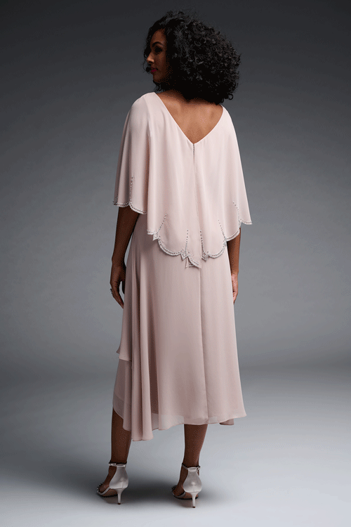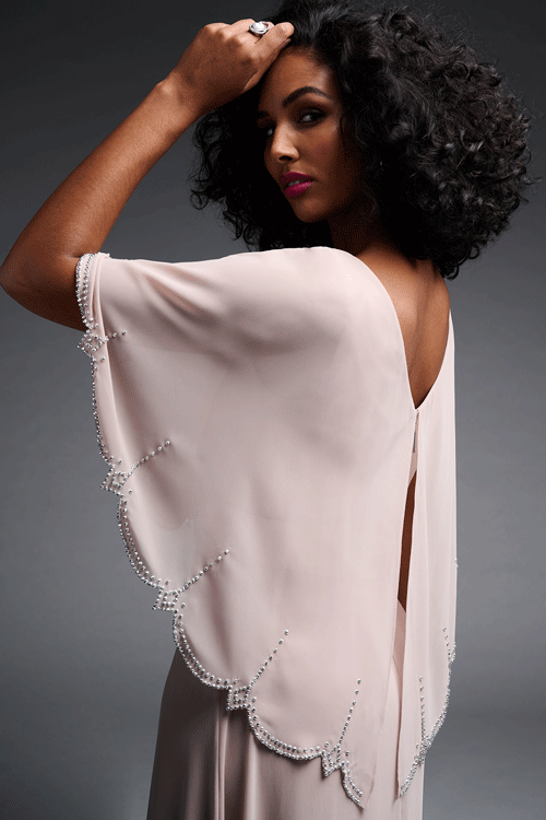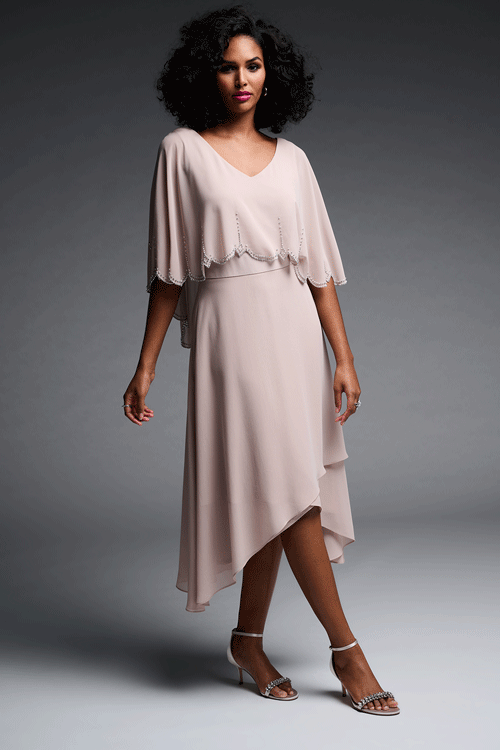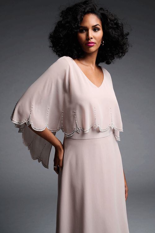 You're sure to be the belle of the ball at your next big event! Renowned for their quality long lasting fabrications and their fabulous fits, the Cape Dress by Joseph Ribkoff is eye-catching, elegant and sophisticated. Cut in a soft handle chiffon, this exquisite design features a crossover front hem and a stretch knit underlayer. However, it is the built in scallop edged chiffon cape trimmed in diamantes that really sets this style apart!