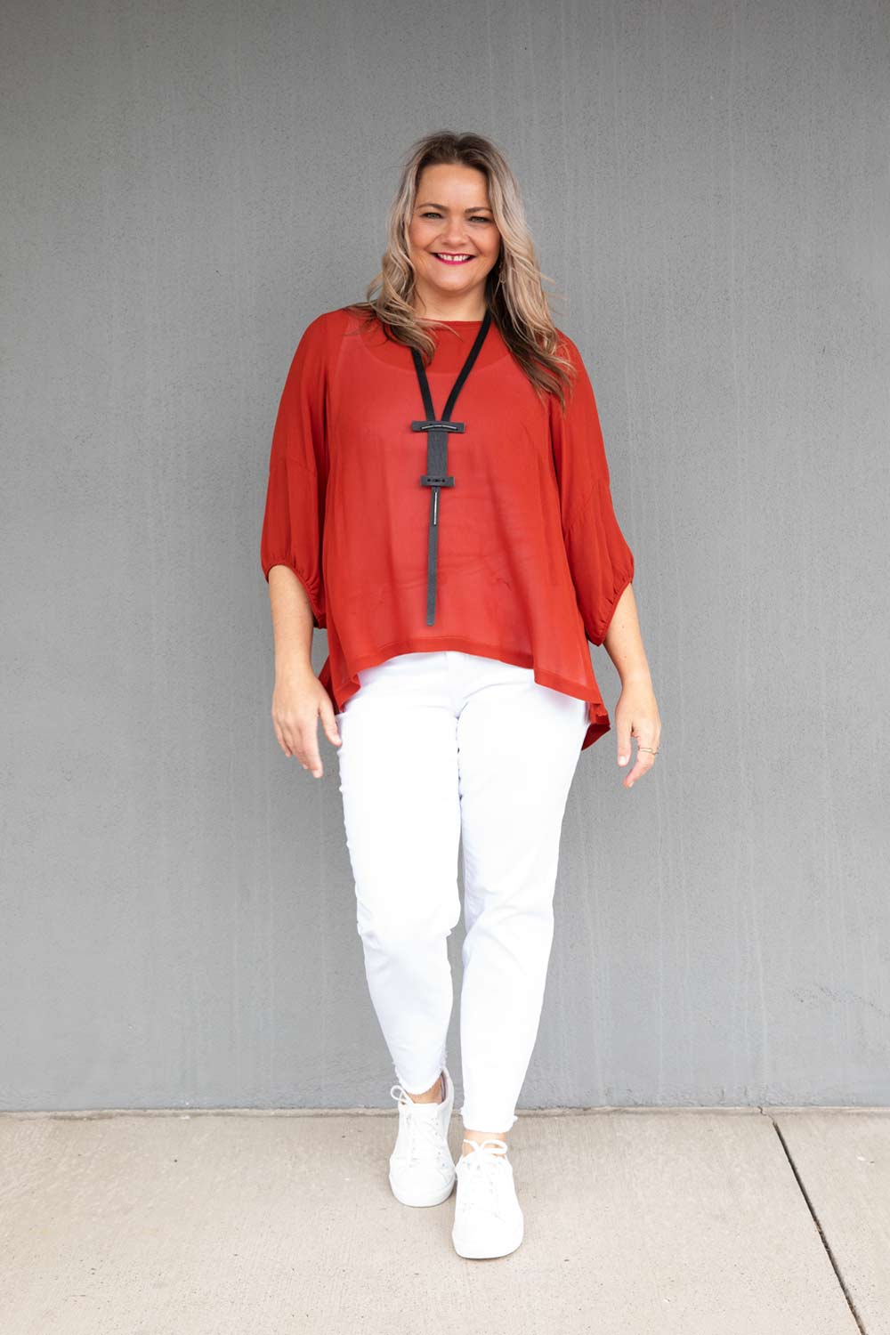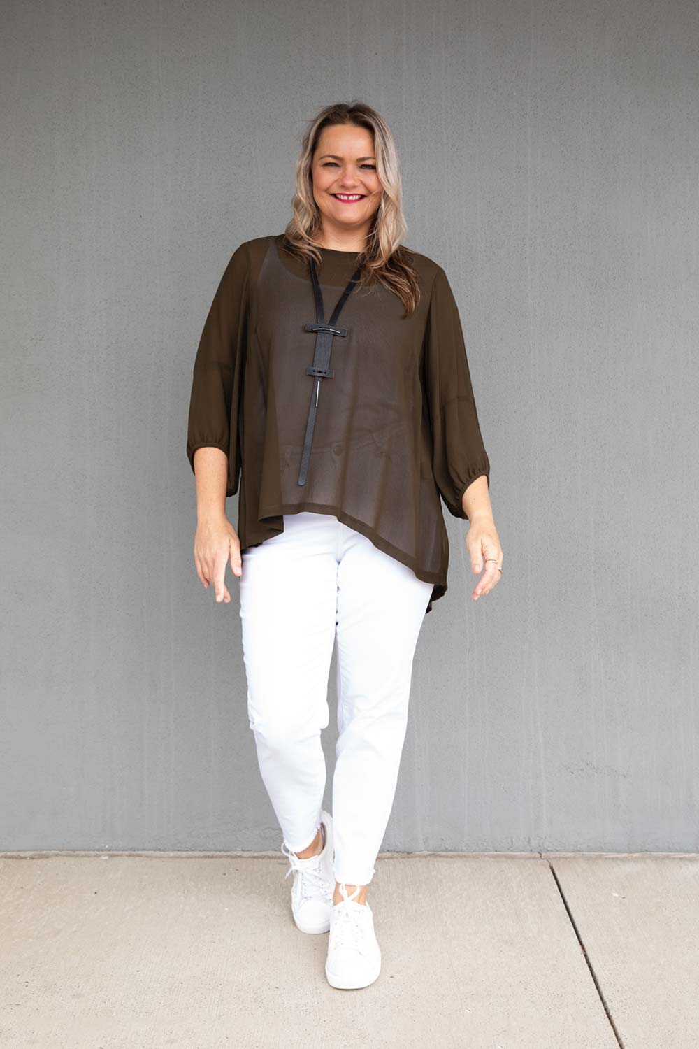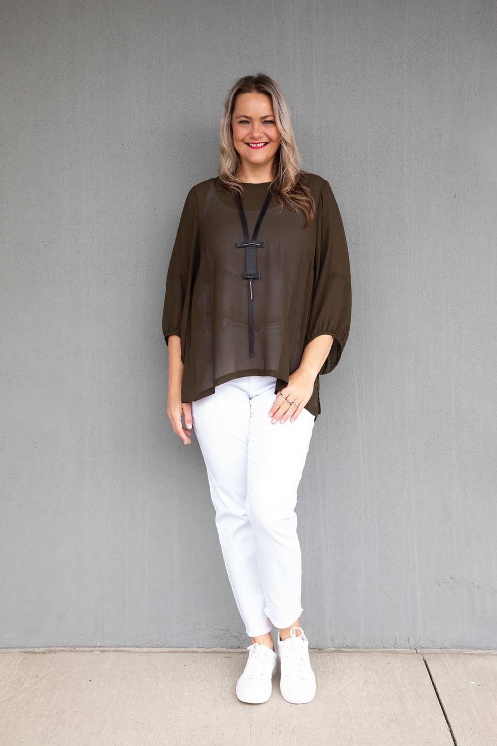 Based off last seasons best selling style, Niovara’s Remix Top is a fun new interpretation. Created exclusively for Magazine and proudly made in New Zealand, this style is cut in a semi sheer viscose. Offered in very wearable colourways, this swing shaped style features a blouson sleeve, and pleated back yoke. Team with a wide leg pant or denim for the ultimate in off duty style.