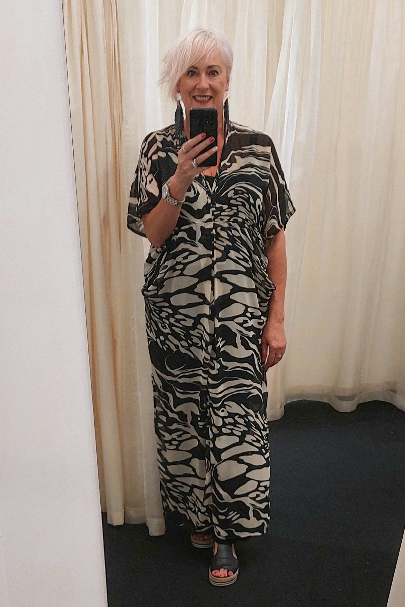 The Philosophy Pheobe Kaftan Tuck Dress is a printed kaftan-style dress offering a relaxed, flowy fit for ultimate comfort and effortless style. The bold print and sheer fabrication make this an easy and versatile style to add to your wardrobe.