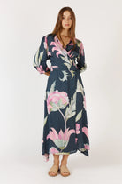 The Ubud Wrap Navy dress offers a refined silhouette with its true-to-size fit and elegant V neckline. Crafted from 100% viscose satin, its slight sheen enhances the sophisticated appeal. Featuring elbow-length sleeves with elasticated cuffs and a flattering thread-through wrap design, this calf-length dress includes two convenient side pockets for practicality. Ideal for those seeking timeless style with subtle luxury.